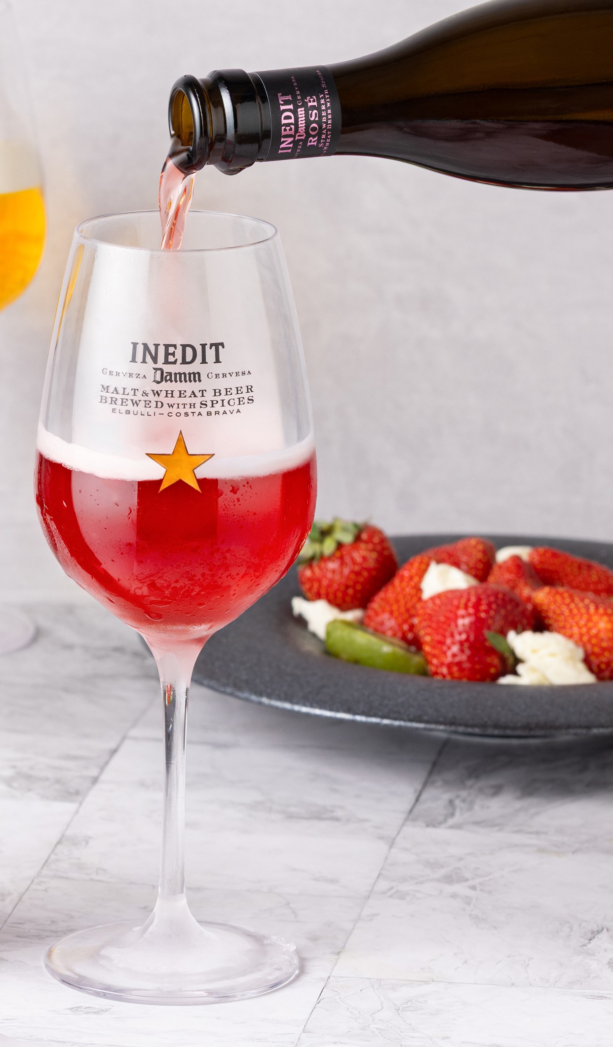 大麦麦芽を使用したラガービールと小麦を使用したホワイトビールをブレンドするという独自の手法で造られる「イネディット」をベースに、濃厚なストロベリーの果汁を贅沢にブレンド。