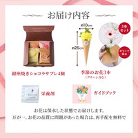LINEギフトでも人気の季節のお花のミニブーケと銀座千疋屋の銀座焼きショコラサブレのギフトセットです。