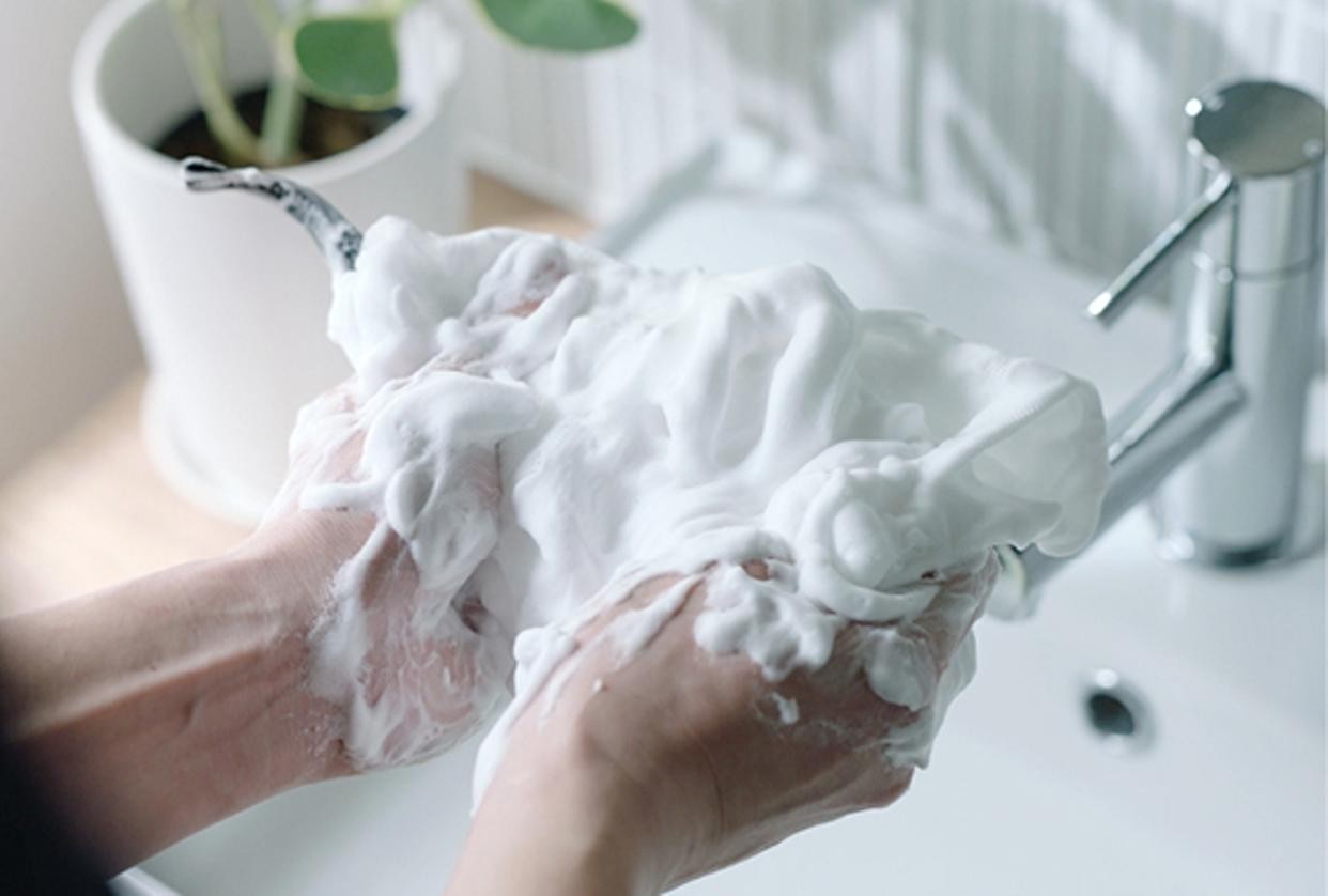 ①10円玉大程度を濡らした泡立てネットに取り、ぬるま湯を少しずつ加え、空気を含ませながら泡立ててください。