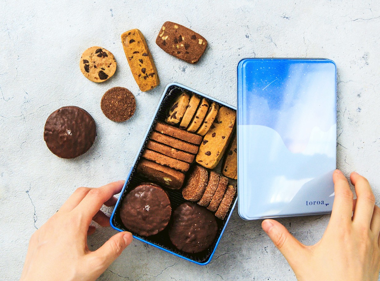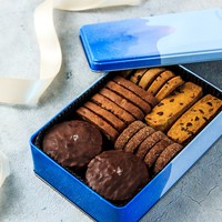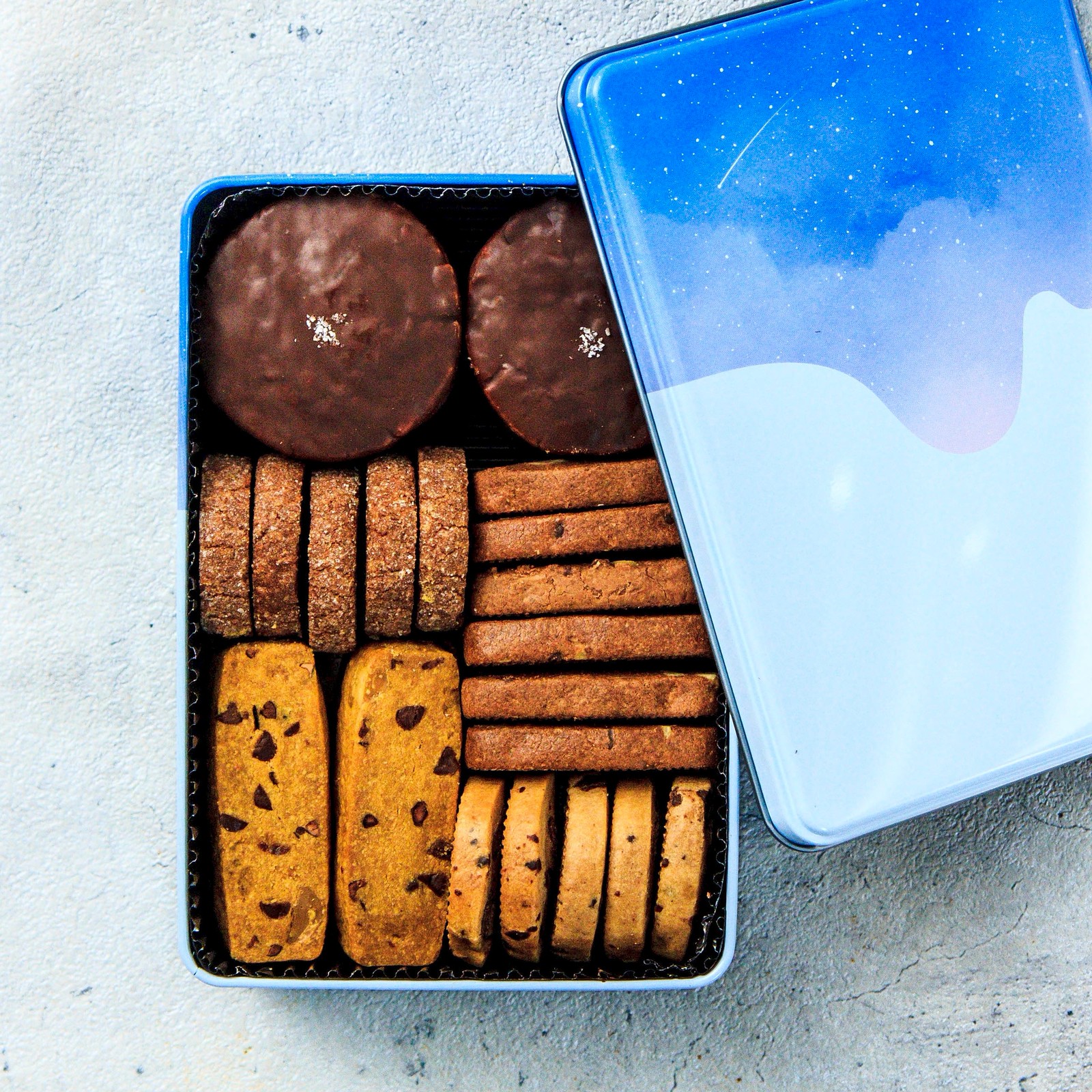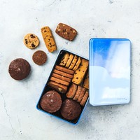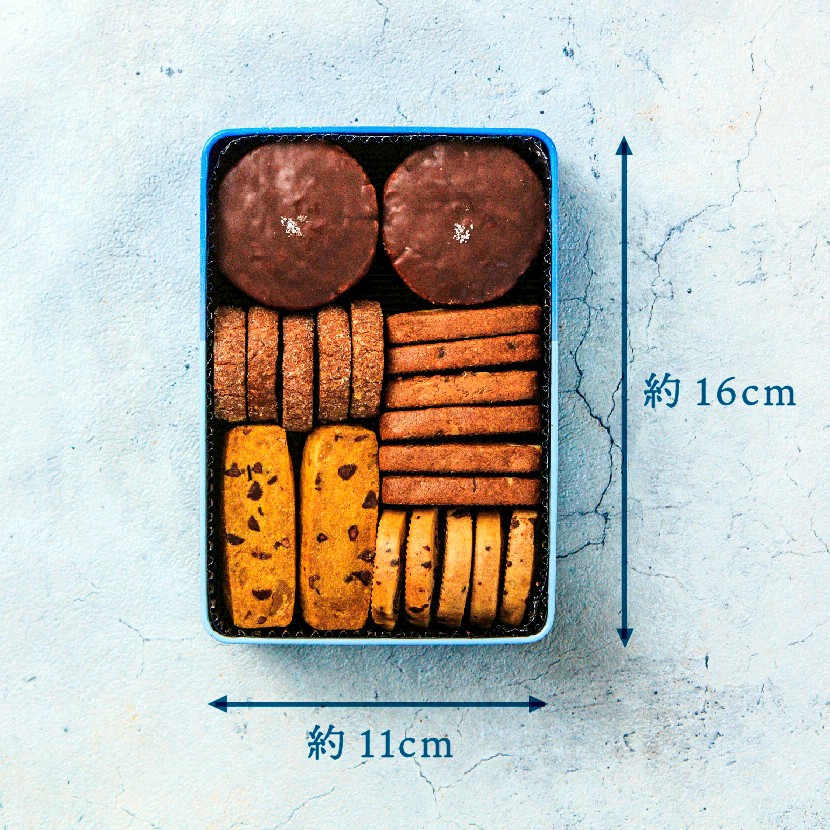 クッキー缶のデザインは夕方から夜へと移ろいで行く空ととろけるイメージ。何色ものブルーが重なり合うようなとてもキレイな缶で、食べ終わった後にも小物入れなどに使いやすいです。