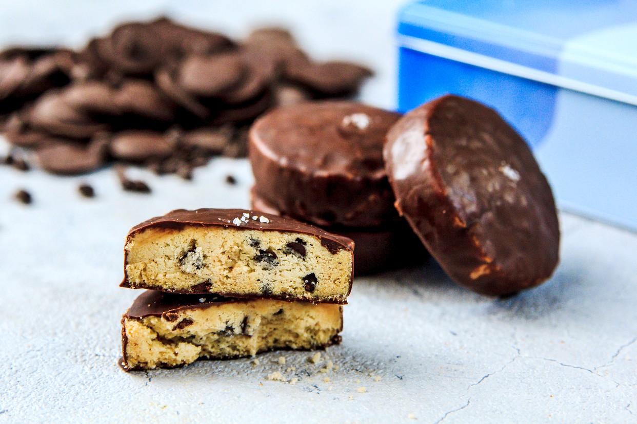 ドミニカ共和国産カカオのチョコチップをたっぷり混ぜ込んだほろほろと口溶けのいいクッキーに4種ブレンドのチョコレートをコーティング。北海道産発酵バター、香ばしいアーモンド、バニラを混ぜ込んだクッキーはリッチな味わいです。