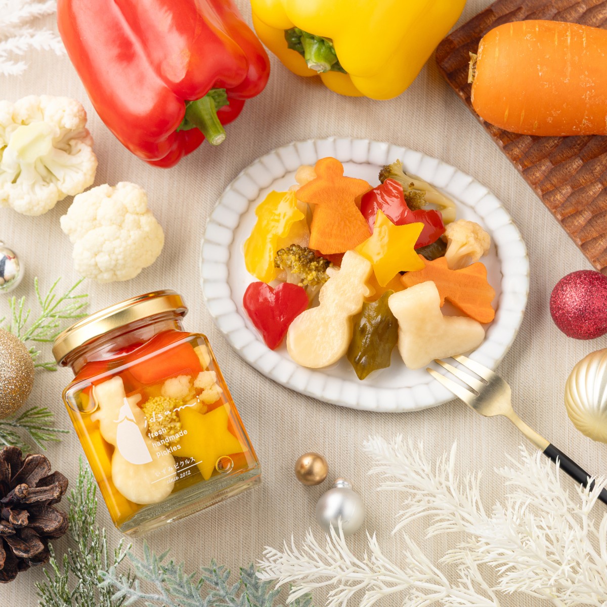 スノーマンやサンタクロース、流れ星など、クリスマスらしい型抜きをした野菜を詰め込みました。合成着色料・保存料無添加のおいしさをフレッシュなサラダ感覚でヘルシー、見た目に美しく、食べておいしく、身体にもいい。大切な方へのギフトとして聖夜のディナーにピッタリのピクルスです。