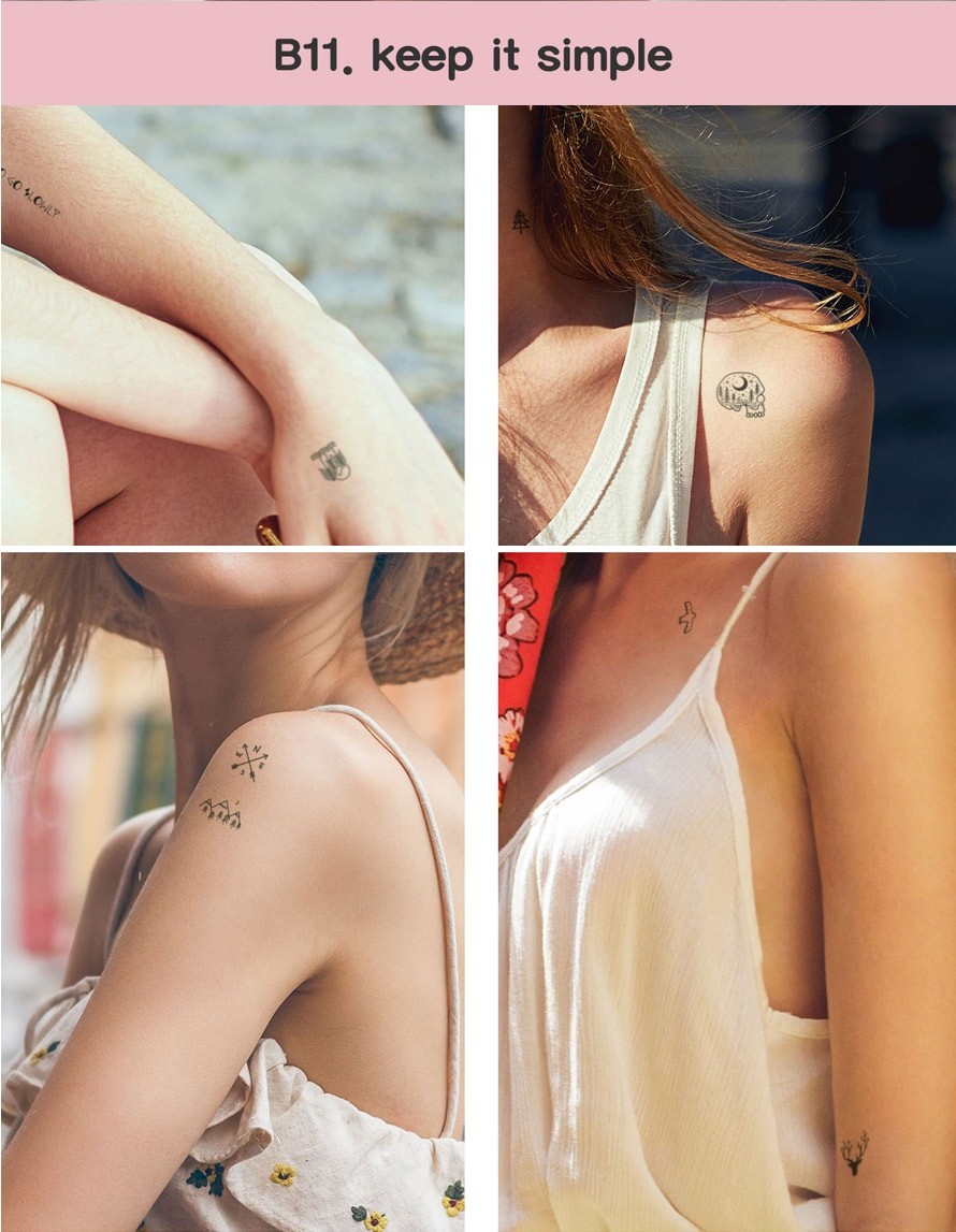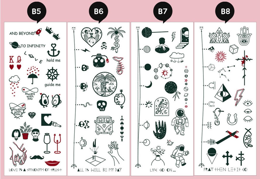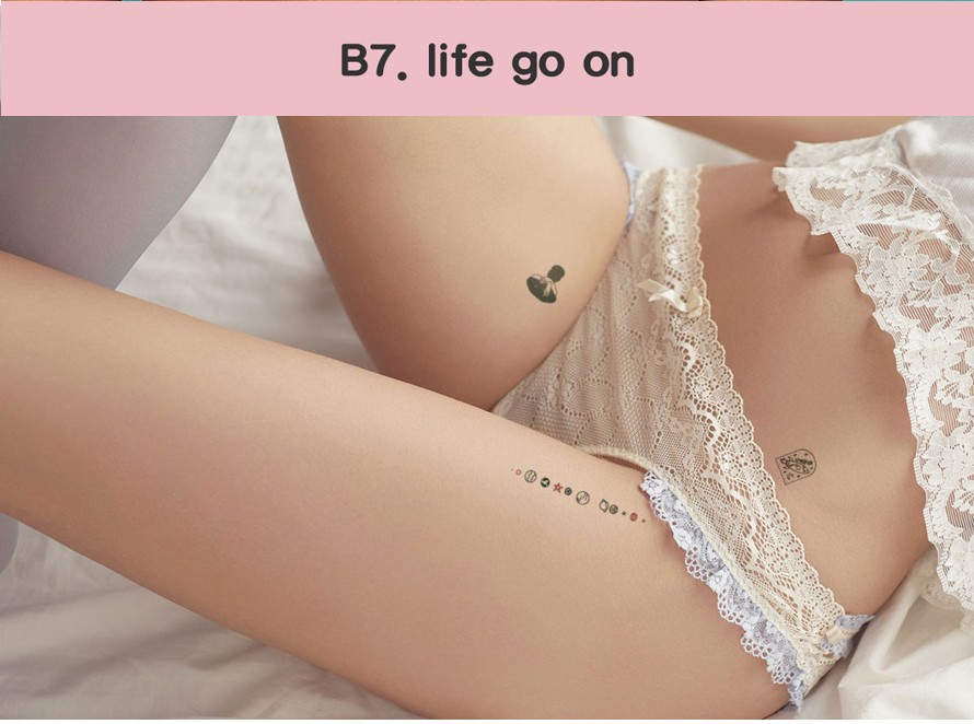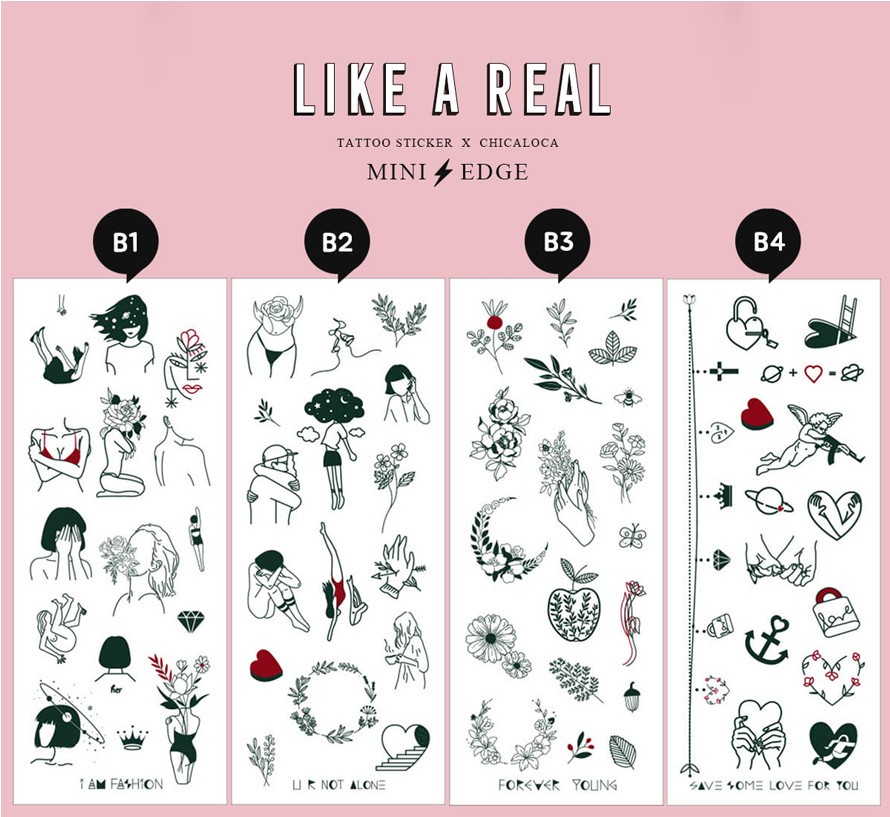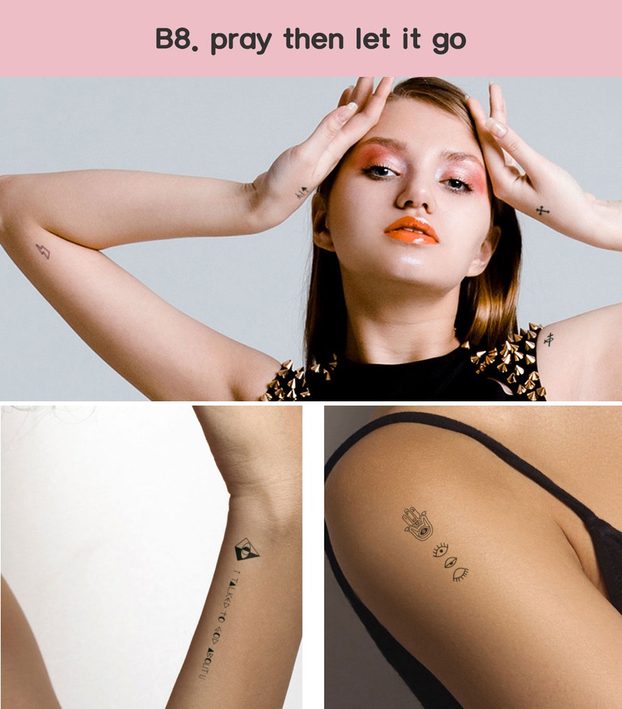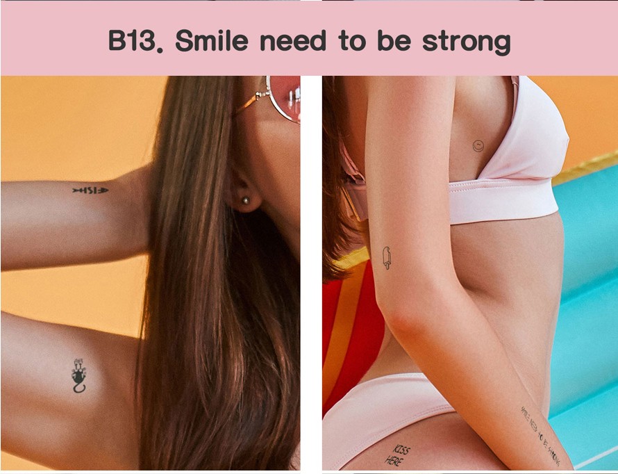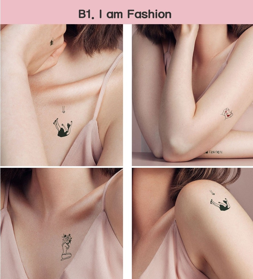 水なしで約10秒間、手でなじませるようにおさえて簡単につけれるタトゥーシールです。