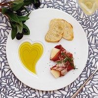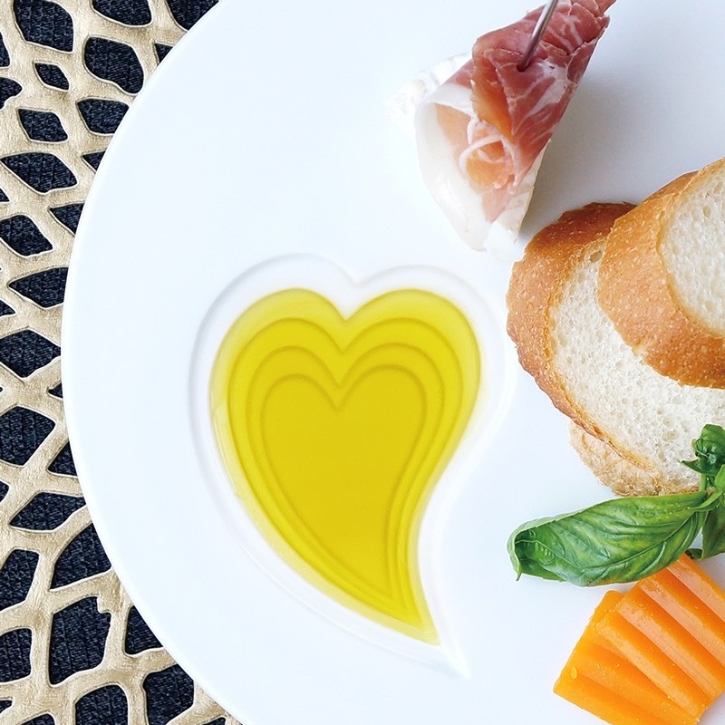フラットなプレートに施された6段のハートの溝にオリーブオイルを注ぐと、美しいグラデーションがふわりと浮かび上がり、食卓に華やかなアクセントを添えてくれます。