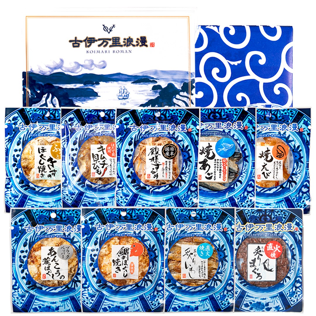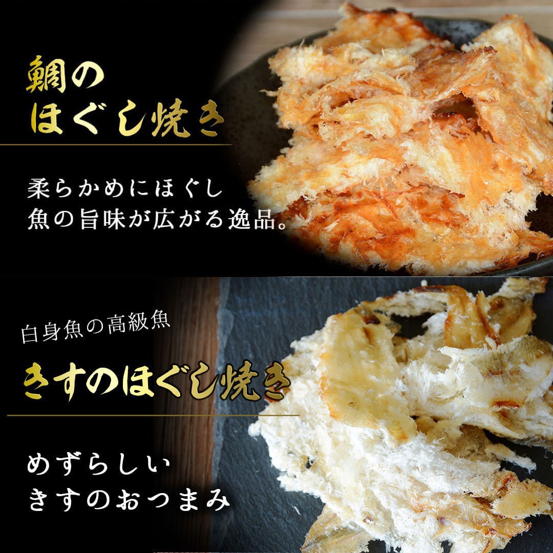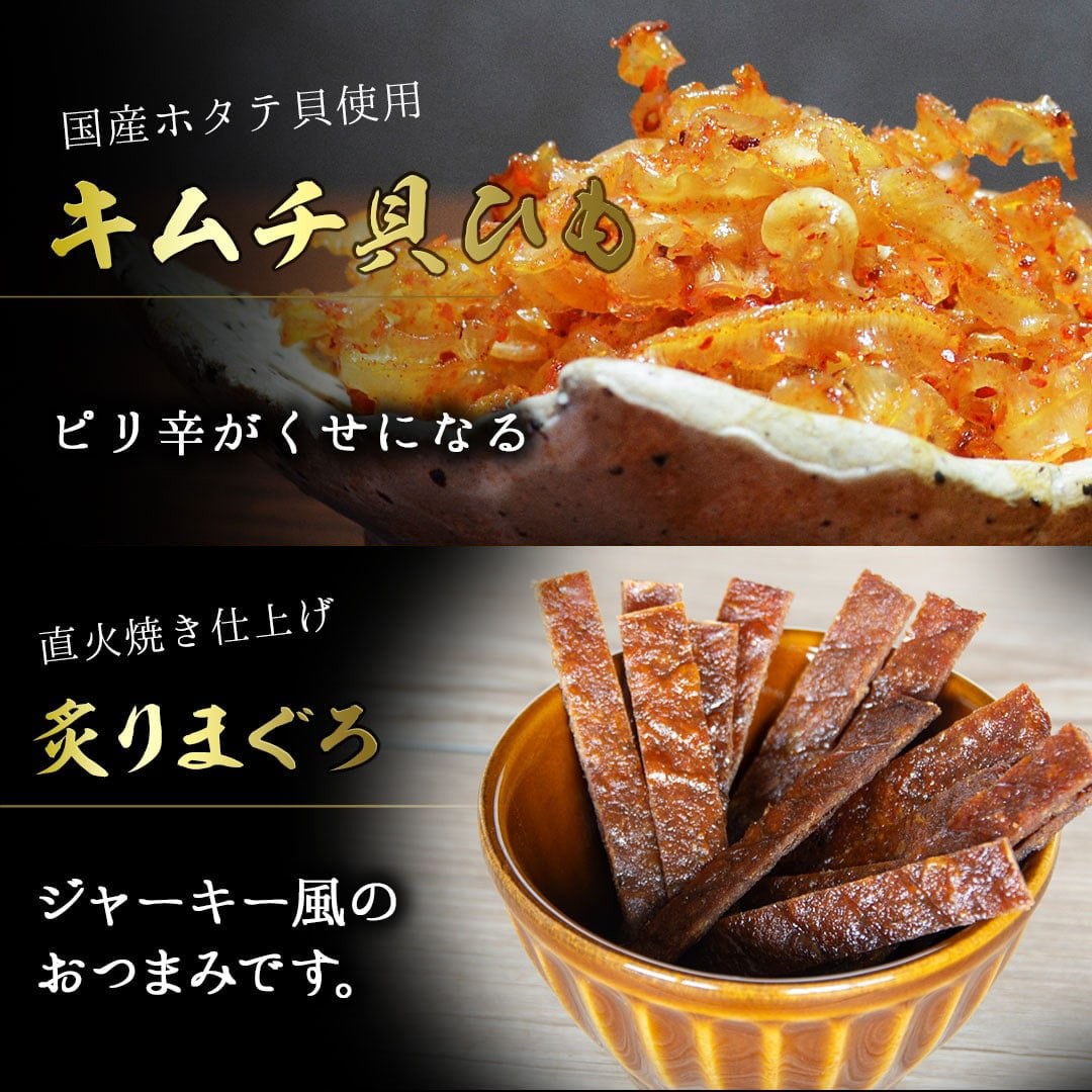 内容量:きすのほぐし焼き16g・鯛のほぐし焼き16g・ブラックペッパーあんこうの荒ほぐし16g・キムチ貝ひも19g・焼あご23g・炙りいわし23g・焼えび16g・炙りまぐろ25g・殿様するめ15g