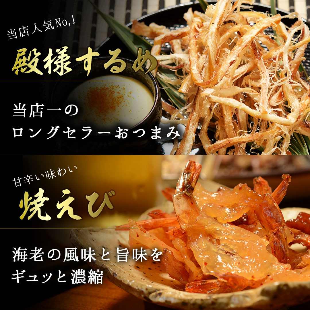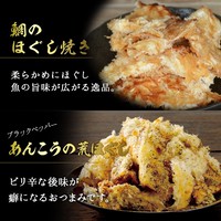 内容量:きすのほぐし焼き16g・鯛のほぐし焼き16g・ブラックペッパーあんこうの荒ほぐし16g・焼あご23g・炙りいわし23g・焼えび16g・殿様するめ15g