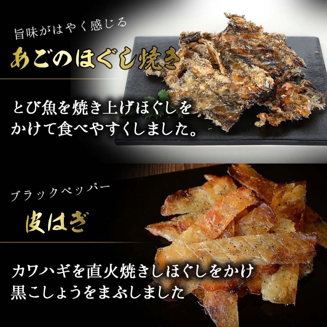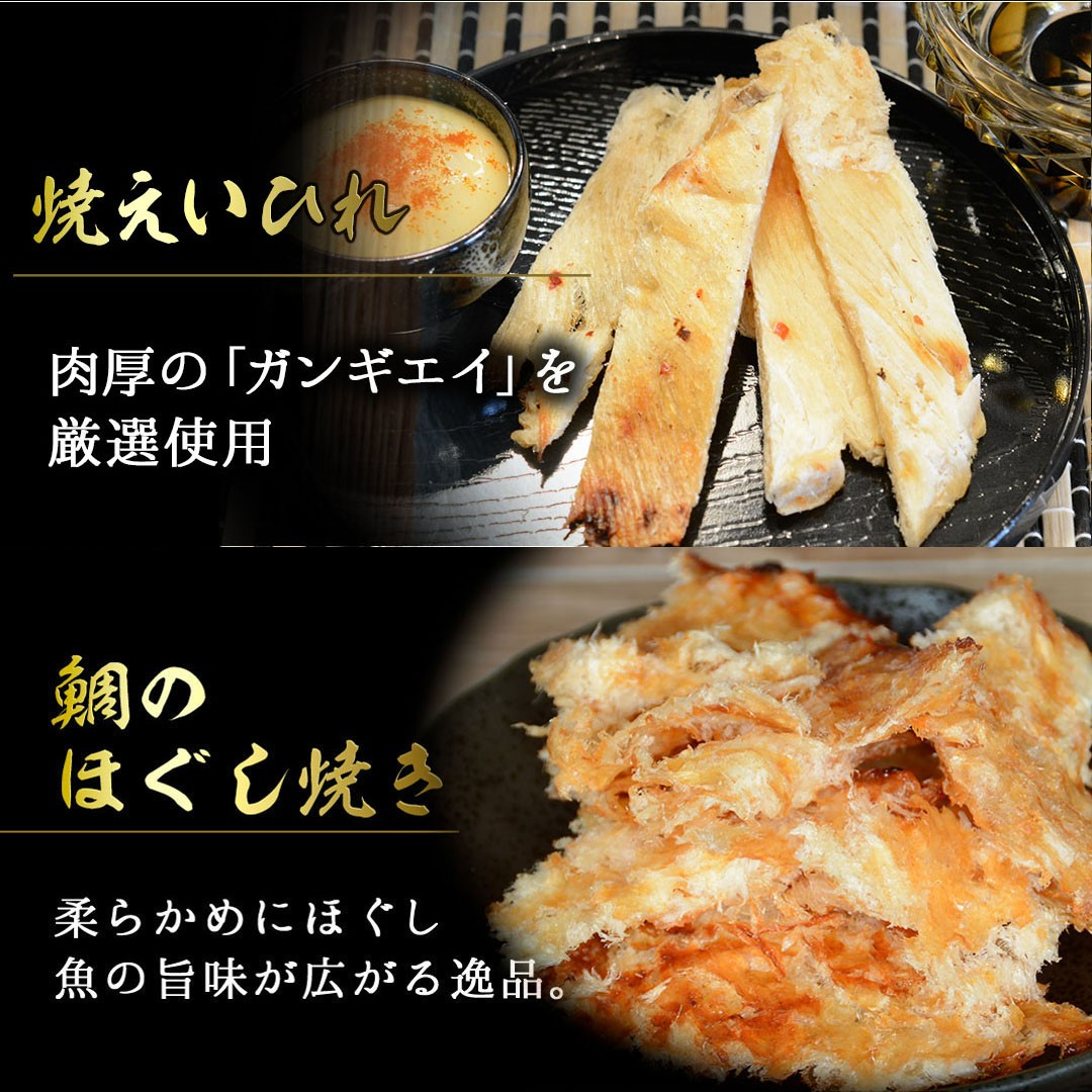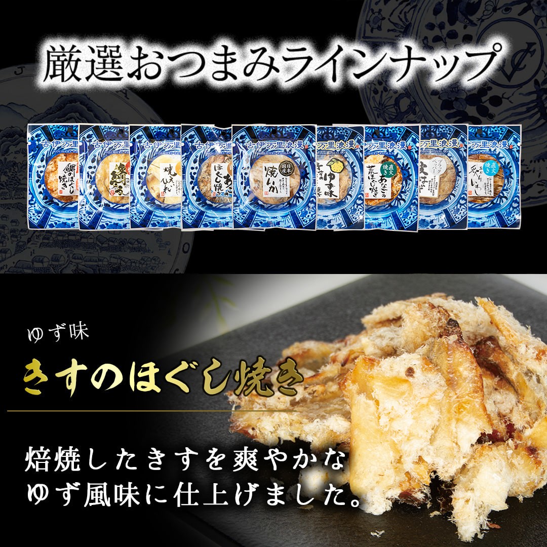 内容量:炙りいわし23g・ゆず味きすのほぐし焼き18g・鯛のほぐし焼き16g・あなごの荒ほぐし焼き16g・焼いか16g・焼えいひれ14g・あごのほぐし焼き17g・炙りあんこう23g・ブラックペッパー皮はぎ25g