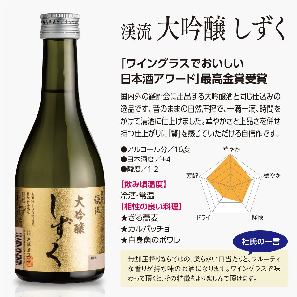 プレミアム酒の「渓流 大吟醸 しずく」がセットになりました。