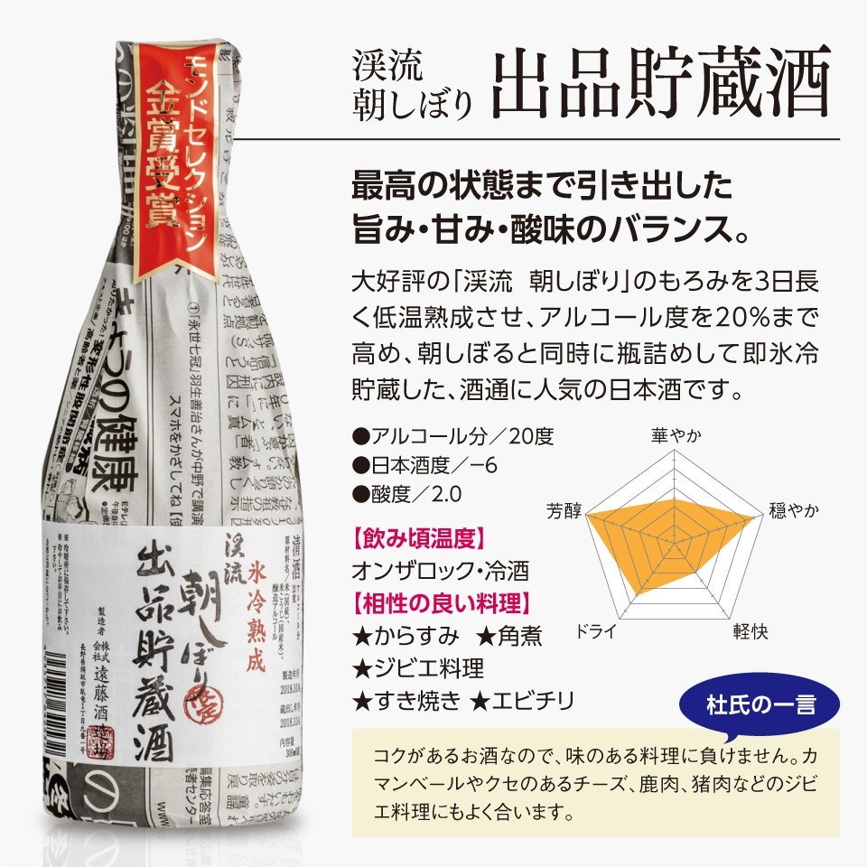 「渓流 朝しぼり」のもろみを3日長く低温熟成させ、アルコール度を20%まで高め、朝しぼると同時に瓶詰めして即氷冷貯蔵いたしました。