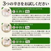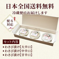 昔ながらの製法でひとつひとつ丁寧に手作りした極上わさび漬け3つの辛さを食べ比べセットです。