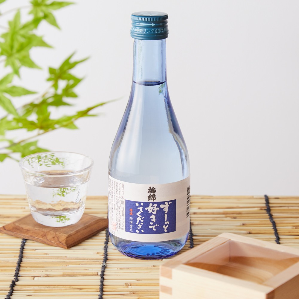 ラベルが目を引く、梅錦山川の日本酒「ずーっと好きでいて下さい」。ふくらみのある味と清々しさが、飲み飽きしないきめ細やかさを伝えてくれるお酒。喉越しがよく、さっぱりとした軽快な飲み心地で、女性でも飲みやすい日本酒です。冷でも熱燗でも美味しくいただけます。