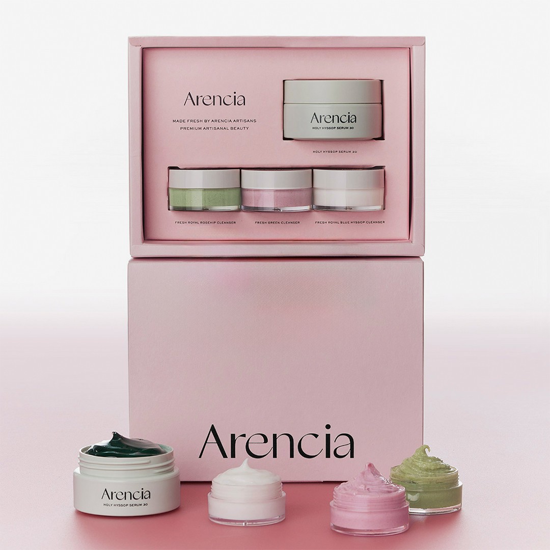 しっとりもちもちな洗い上がりのもちソープ3種と、しっとり潤うセラムのセットには、Arenciaが選んだもちソープベスト3のミニチュアサイズが!