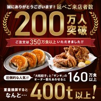 圧倒的な人気を誇る、超大粒餃子&ザンギのオーダー数はあわせて『160万食以上』、重量に換算するとなんと…\400トン以上!/にまで及びます。地元の皆様や道外から北海道を訪れた皆様も、名物グルメの餃子を求めてご来店いただいております。