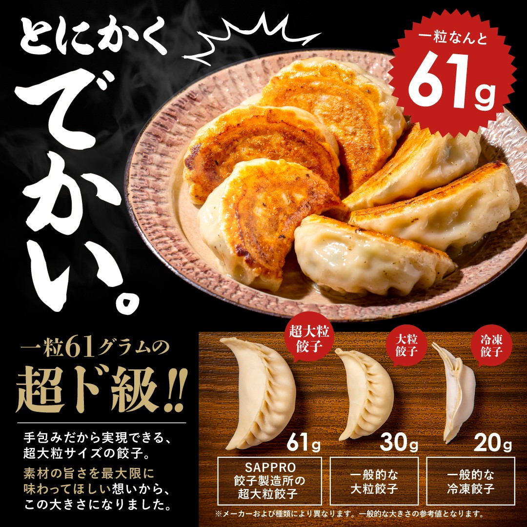 一粒『60グラム超え』の超ド級サイズ!手包みだから実現できる、超大粒サイズの餃子です。素材の旨さを最大限に味わってほしい想いから、この大きさになりました。※一般的な冷凍餃子の約3倍の大きさ