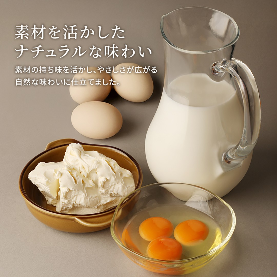 プロセスチーズ(フランス製造)、乳等を主要原料とする食品、液卵、砂糖、牛乳、コーンスターチ、小麦粉/乳化剤、香料、ゲル化剤(ペクチン)、pH調整剤、酸化防止剤(亜硫酸塩)、(一部に小麦・卵・乳成分・りんごを含む)