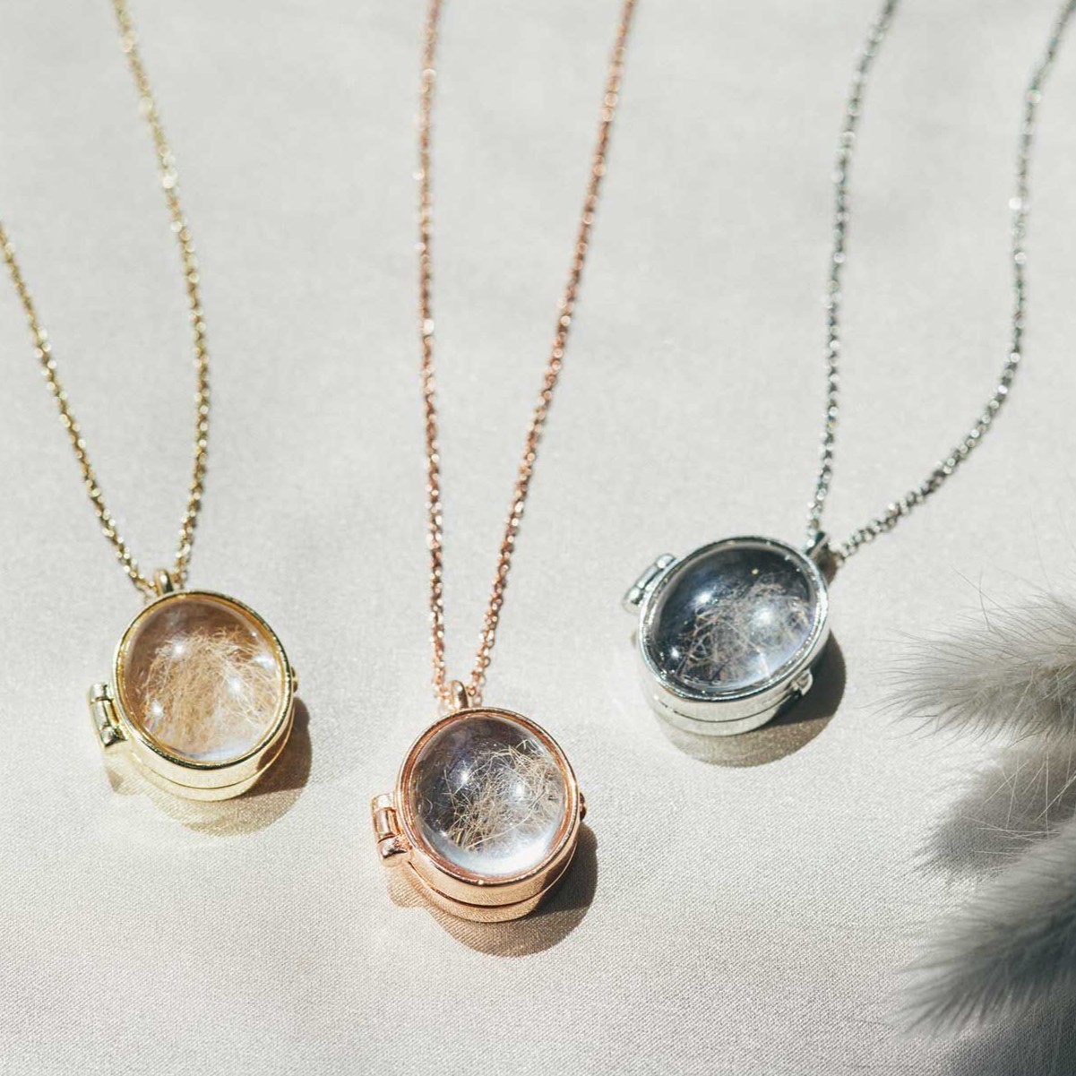 「離れていてもうちの子を身近に感じたい」という方におすすめしたい、猫毛がアクセサリーになっちゃうペンダント。ロケットを開けて毛を入れると、カボション越しの猫毛がまるで天然石のような美しい模様に。お手持ちのビーズなどを入れても美しく仕上がります。