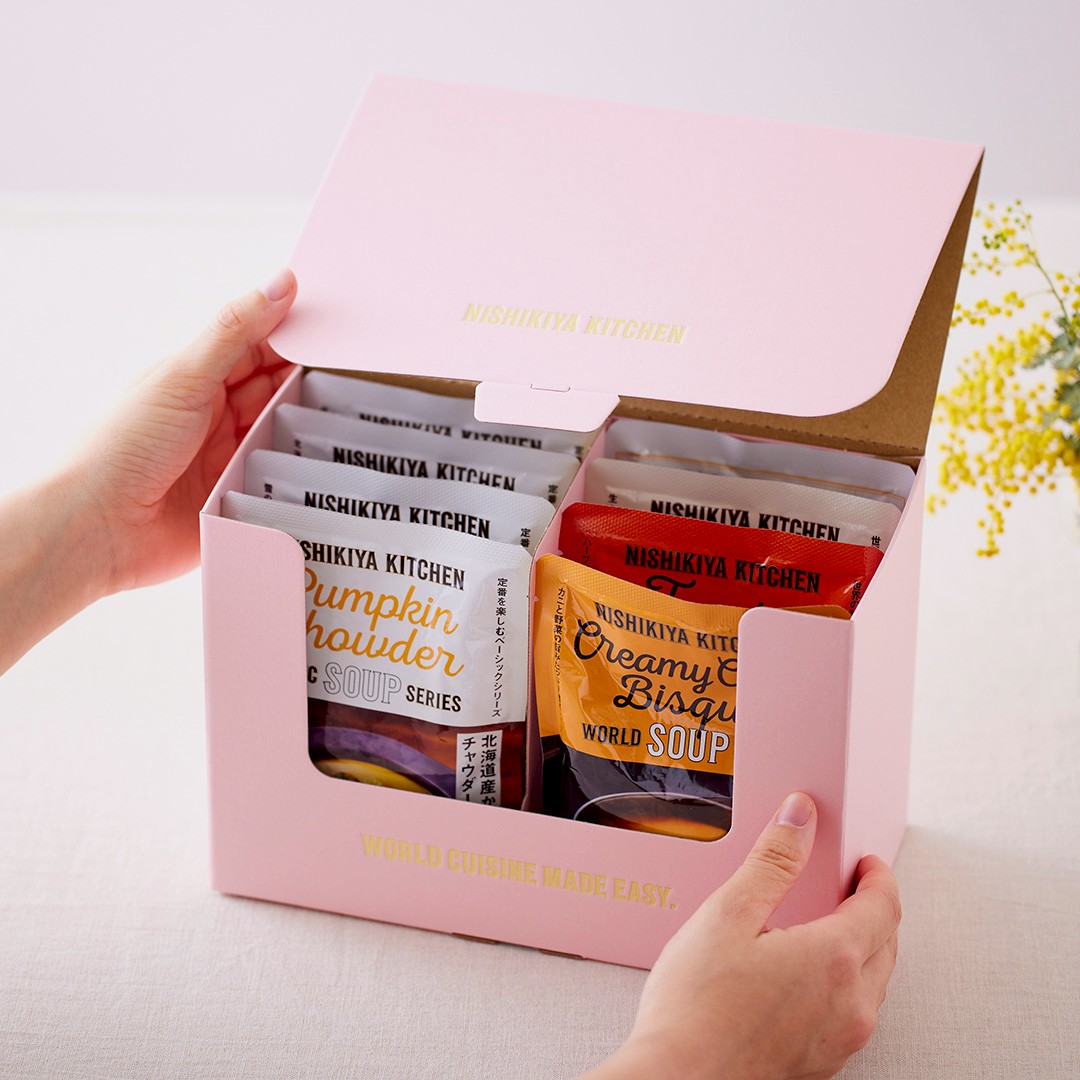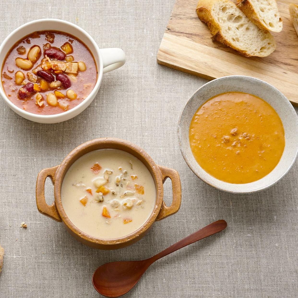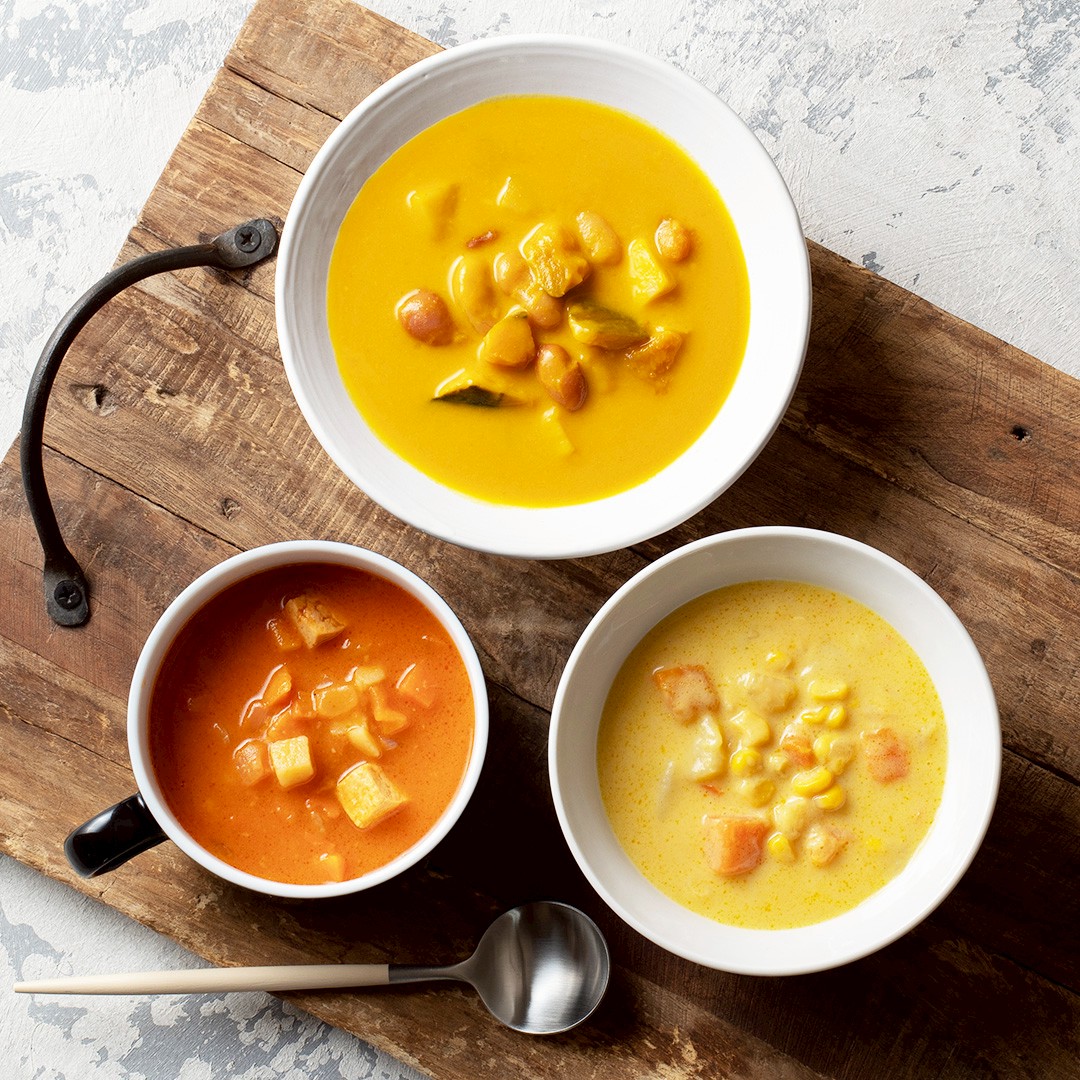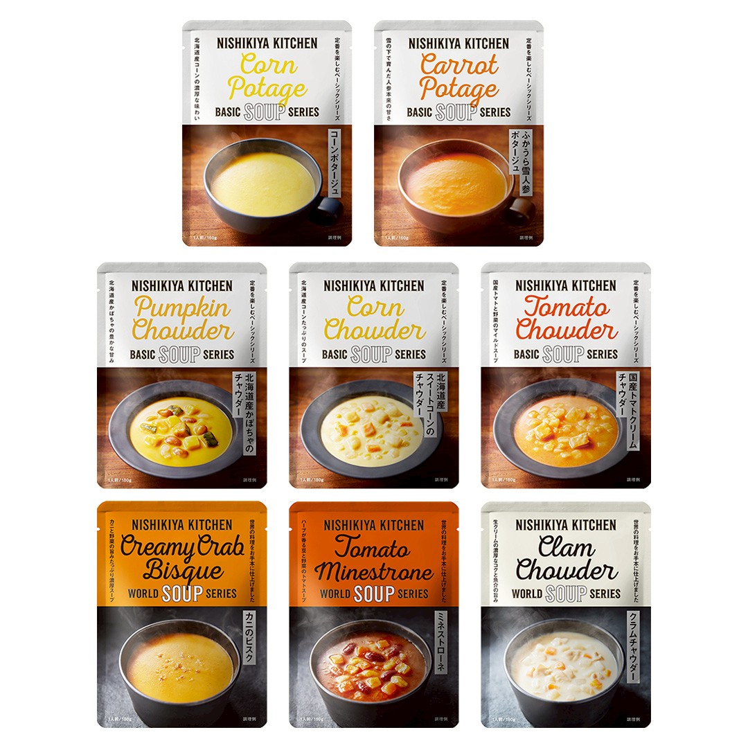 国産野菜がゴロッと入ったチャウダー、おうちで本格レストランの味が楽しめるスープと素材のおいしさを味わう濃厚ポタージュの計8種をセレクト🎁温め5分のカンタン調理が嬉しい、からだも心もほっと温まるラインナップです❄