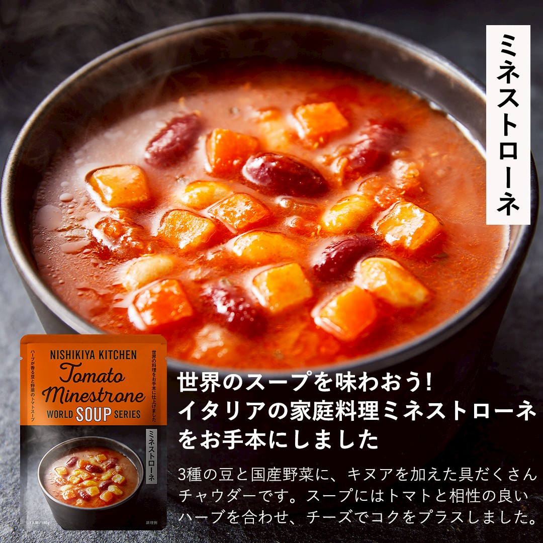 『NISHIKIYA KITCHEN』は カレー、スープ、パスタソース、幼児食など、約100種類のレトルト食品を取り揃えた専門ブランドです。自然のおいしさにこだわり、素材の味わいを生かしたレシピですべて自社製造しています。(本社工場:宮城県岩沼市)