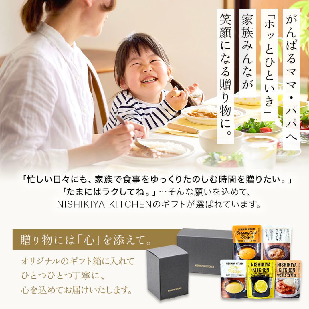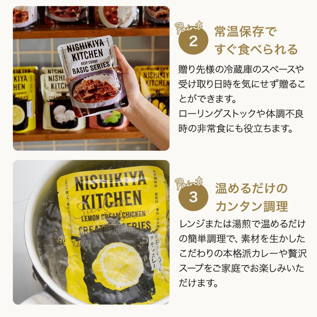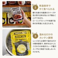『NISHIKIYA KITCHEN』は カレー、スープ、パスタソース、幼児食など、約100種類のレトルト食品を取り揃えた専門ブランドです。自然のおいしさにこだわり、素材の味わいを生かしたレシピですべて自社製造しています。(本社工場:宮城県岩沼市)