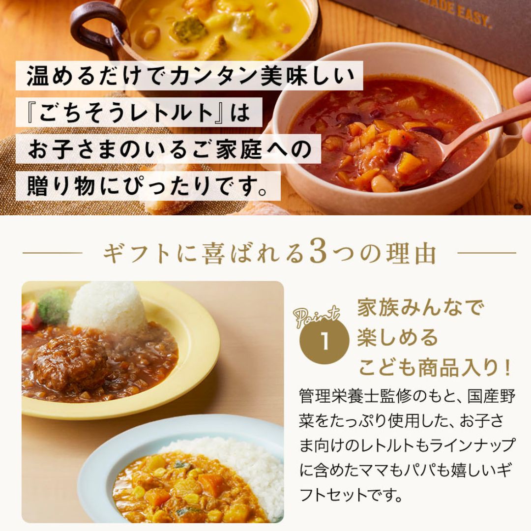 毎日家事や子育て、仕事と目まぐるしい日々を送るママパパへ温めるだけで簡単にお召し上がりいただける「ごちそうレトルト」の贈り物🎁