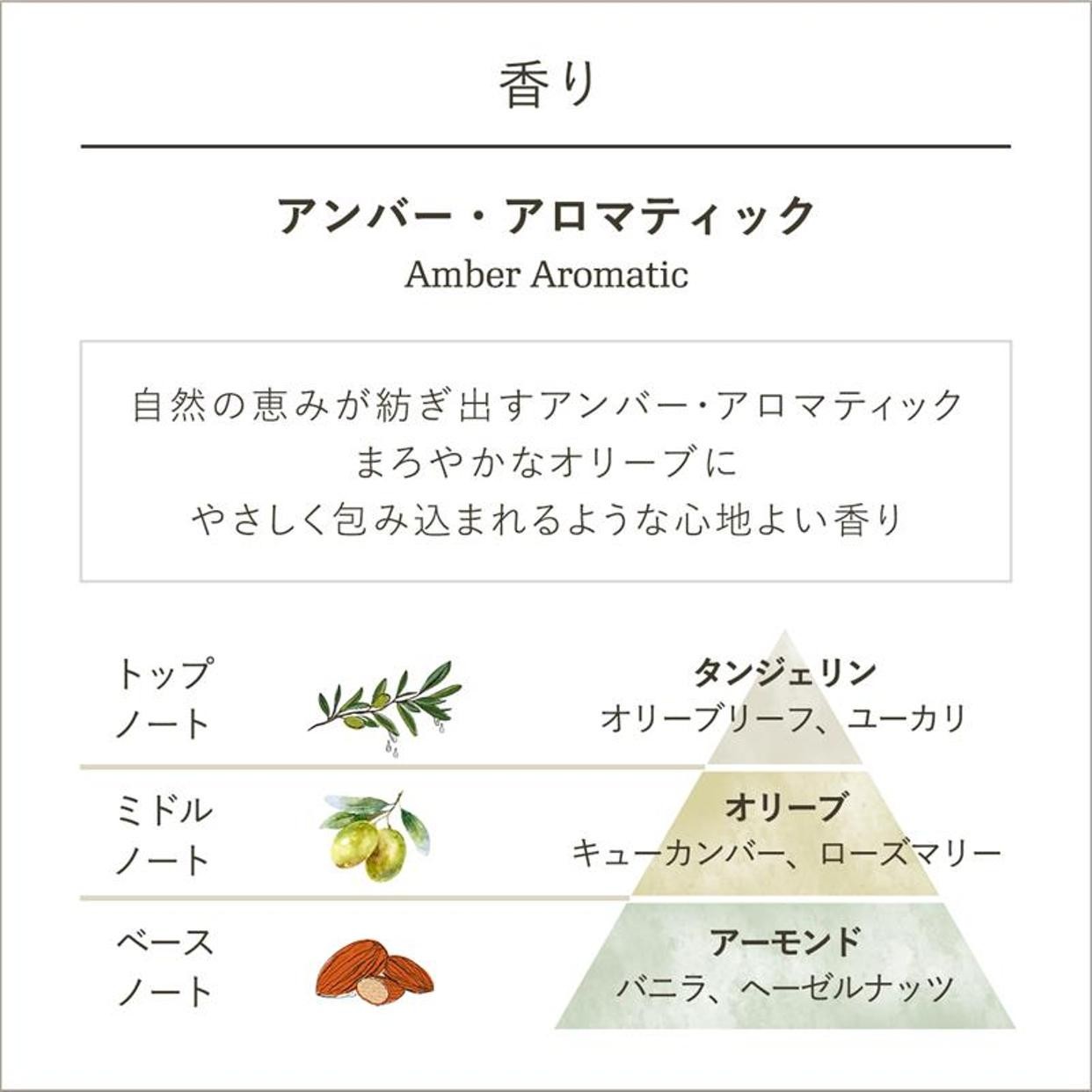 自然の恵みが紡ぎ出すアンバー・アロマティック。まろやかなオリーブにやさしく包み込まれるような心地よい香り