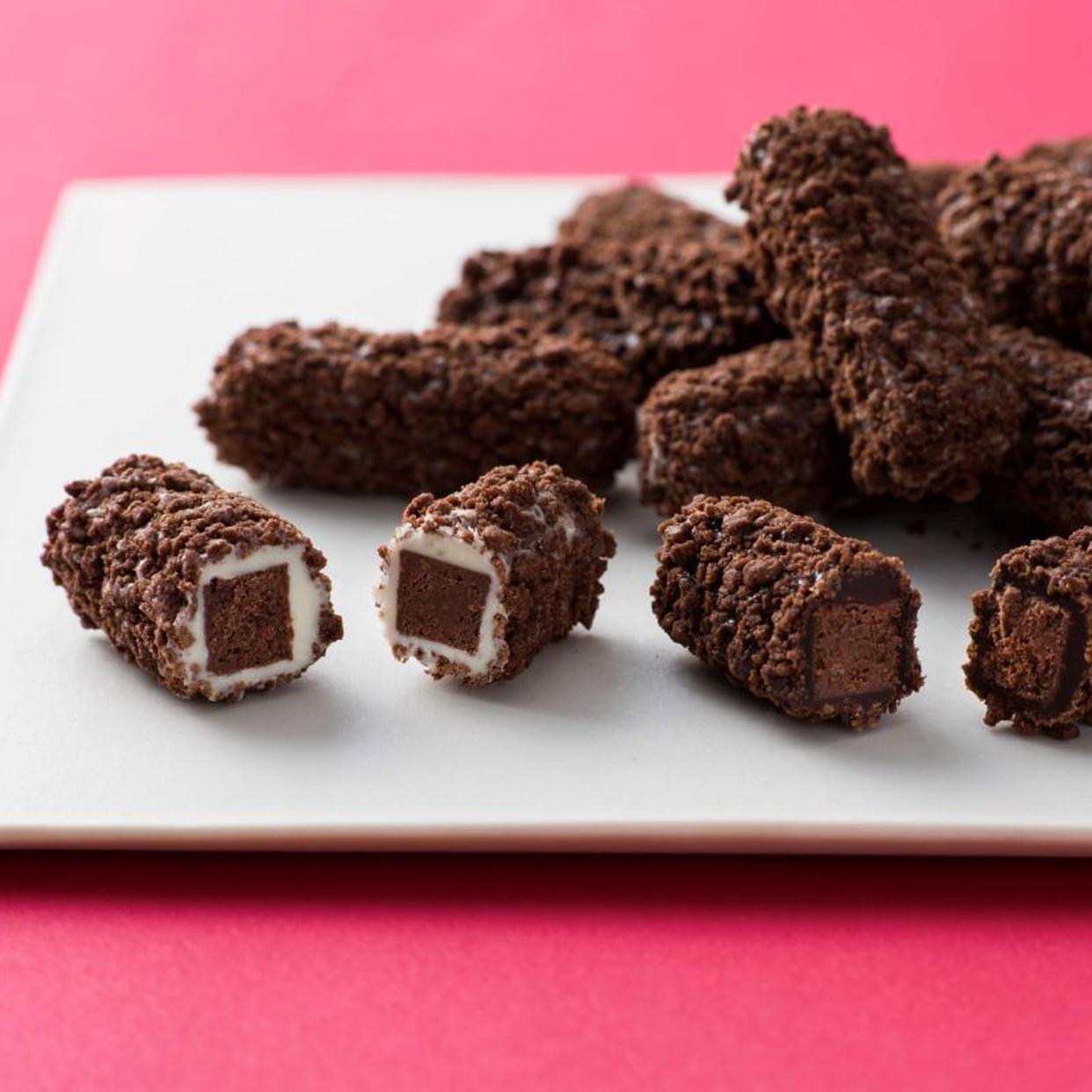 ココアクランチを加えた風味豊かなチョコレートを、なめらかなチョコレートで包み込み、さらにココアクランチをまぶしました。3層の味と食感をお楽しみいただける、ひとくちサイズのリッチなチョコレートです。