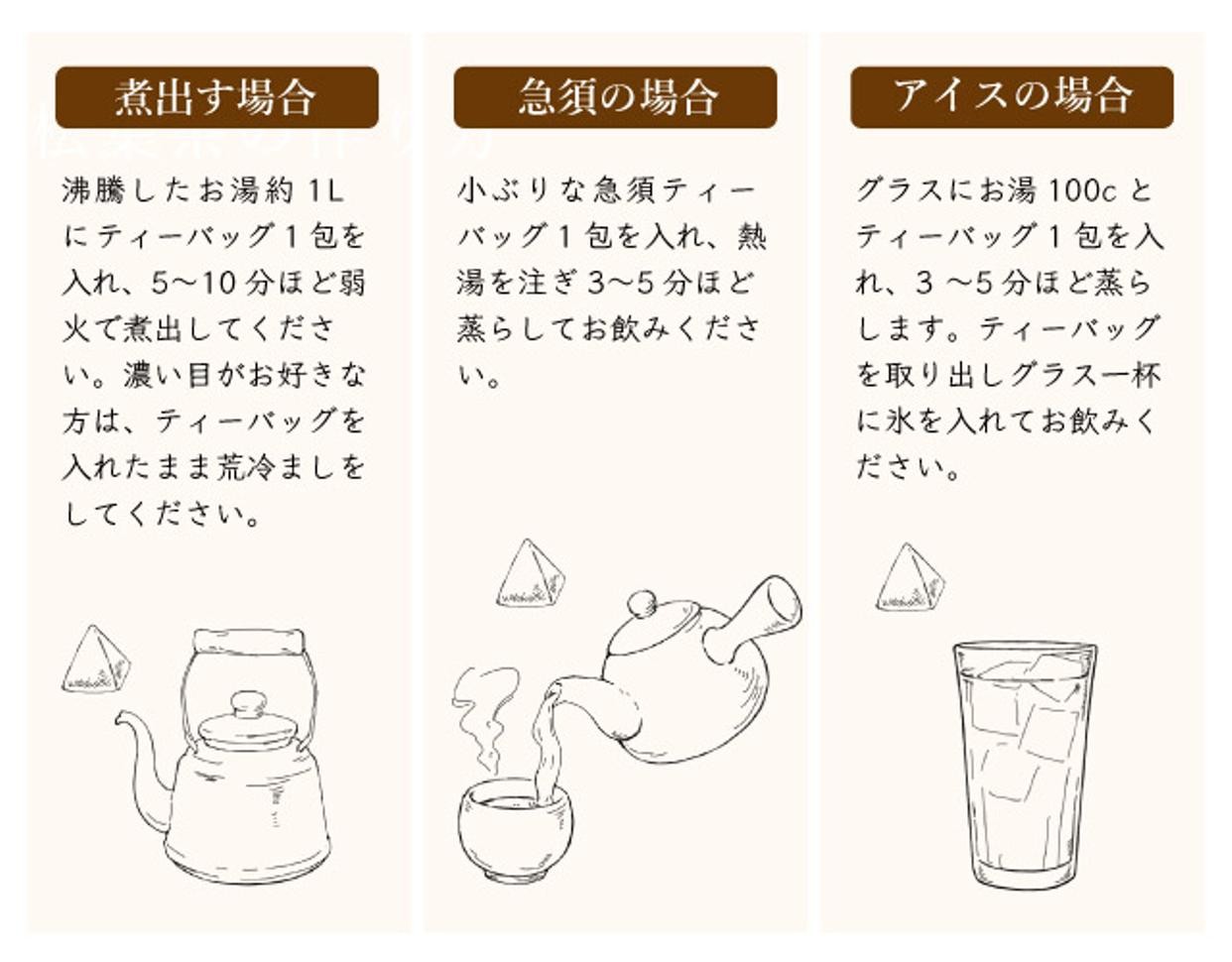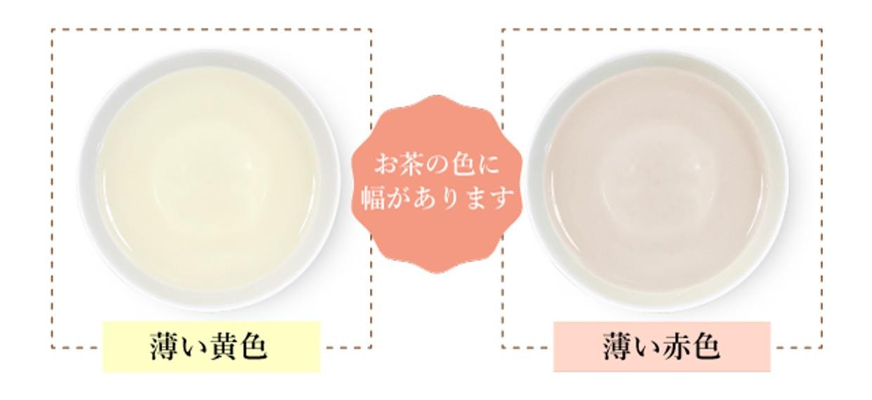 抽出条件や原料の部位により、薄い黄色や薄い赤色など、出来上がりのお茶の水色に幅があります。品質に問題はございませんので、安心してお召し上がりください。