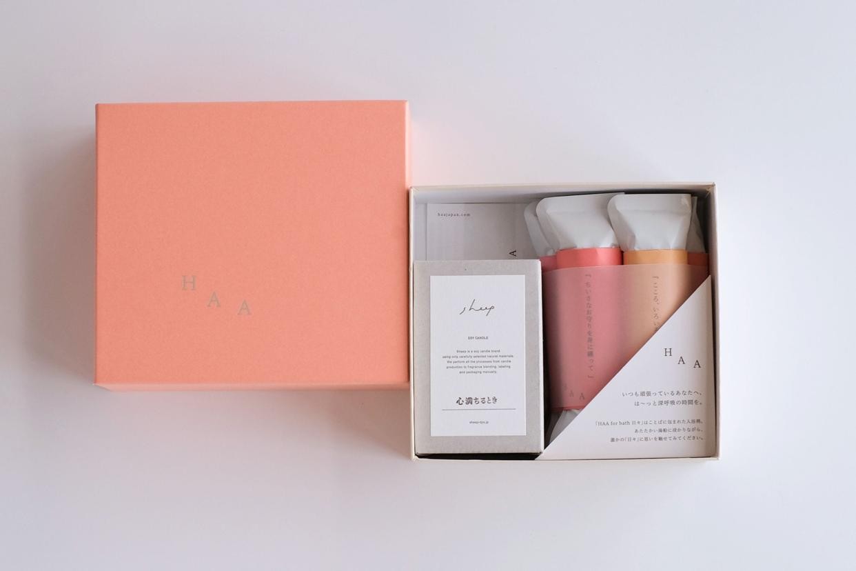 日々の疲れを癒し、贅沢なひとときを贈る、特別なギフトボックスを数量限定で作りました。HAAオリジナルの香りが漂うsheepのアロマソイキャンドルと、心がじんわり満ちていくエッセイに包まれた入浴剤5個がセットに。日々頑張っているあなたへ、そして大切な人へ、お疲れさまの気持ちを送りませんか?