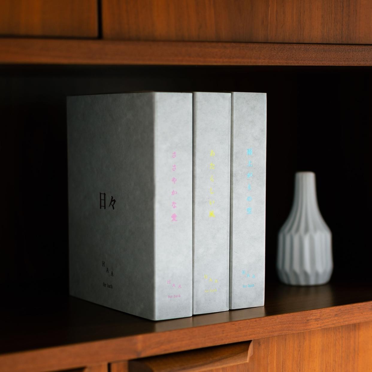 シンプルで洗練されたデザインは、脱衣所やお部屋、本棚に置いておいてもインテリアに溶け込み、さりげないおしゃれさをプラスしてくれます。一見入浴剤だと気づかないような目を引くデザインで、心に残る印象深いギフトボックスになっています。