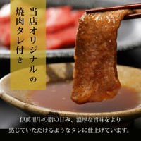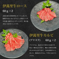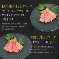 ロース(赤身)60g×2・特上ロース(サーロイン・リブロース・ザブトンのいずれか)60g×2・上カルビ(トモバラ)60g×2・カルビ(ブリスケ)60g×2、焼肉用つけだれ付