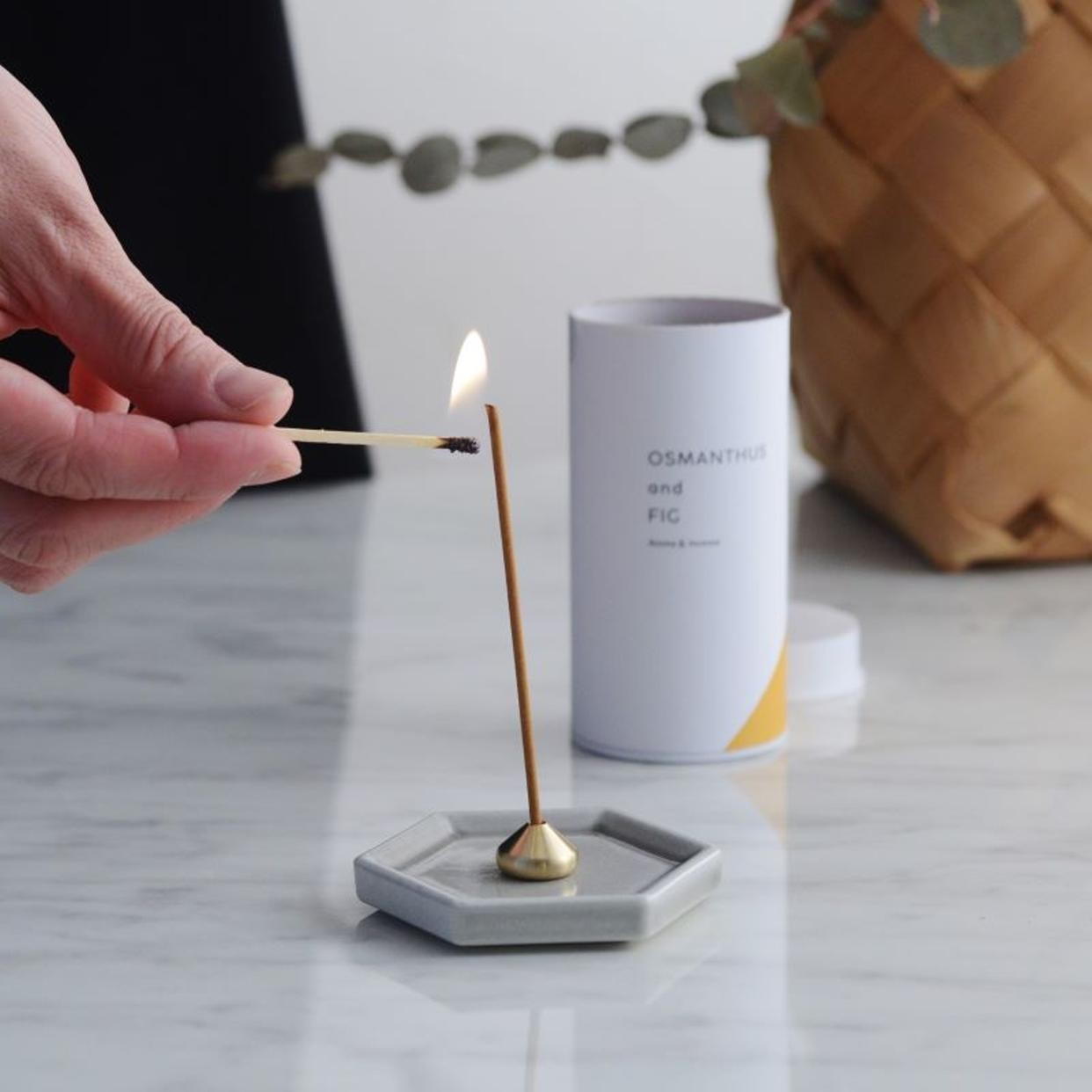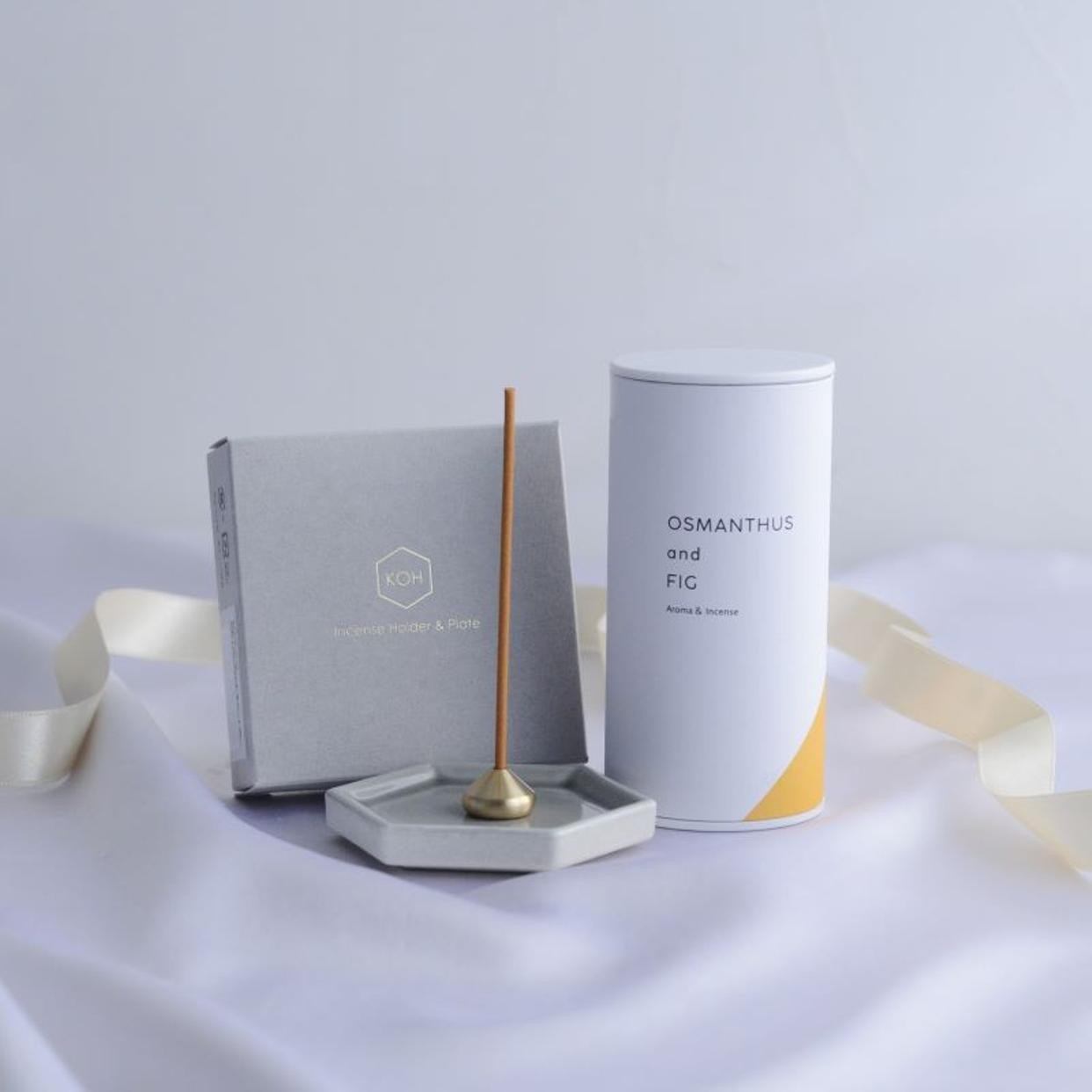 セット内容:お香(オスマンサス、フィグ)、香立てセット(小皿、スタンド)