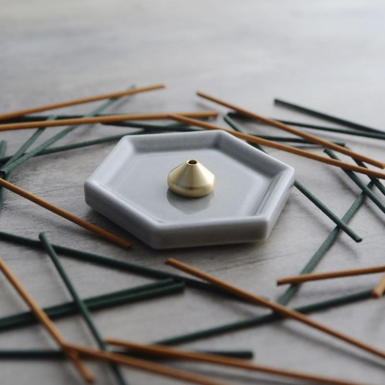 原材料:お香/タブ粉、炭粉、香料、香立て皿/陶器、スタンド/真鍮
