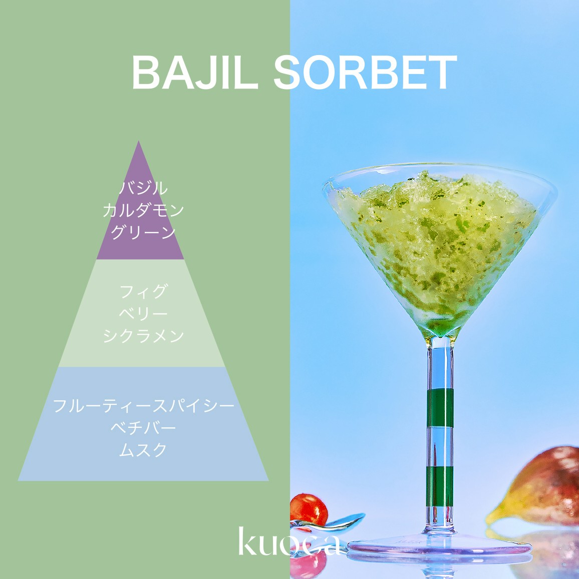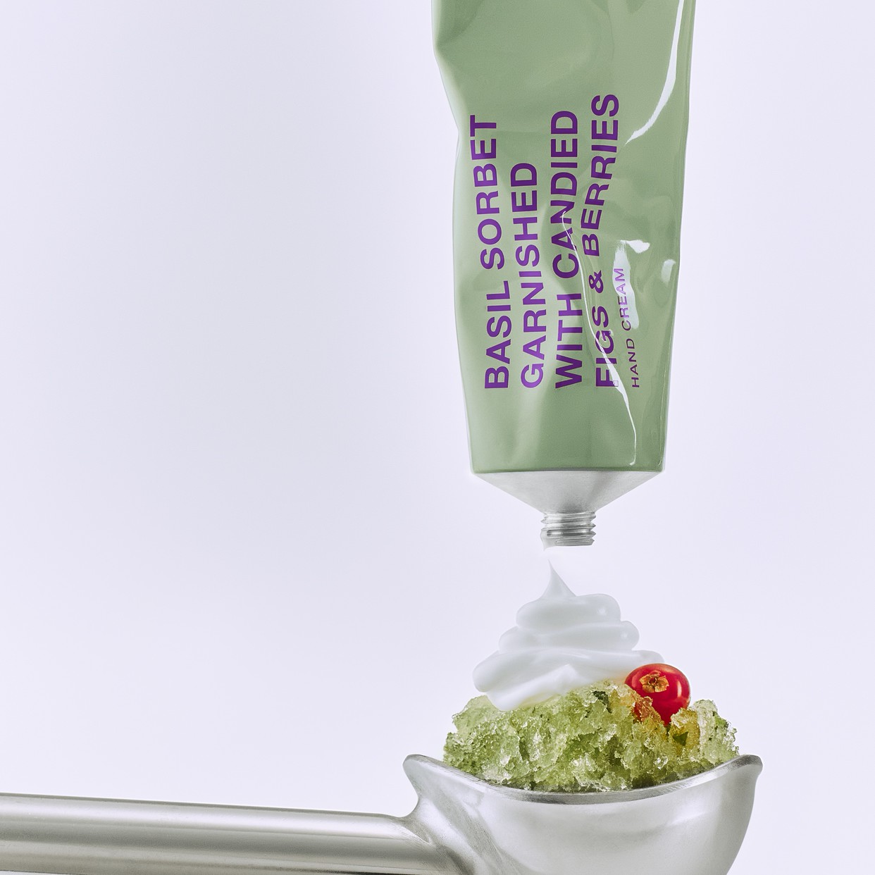フレッシュなバジルリーフをブレンドした爽やかなソルベに、 キャンディコーティングされたイチジク&甘酸っぱいベリーをトッピング。フルーティな果汁が口いっぱいに弾ける瞬間を閉じ込めました。