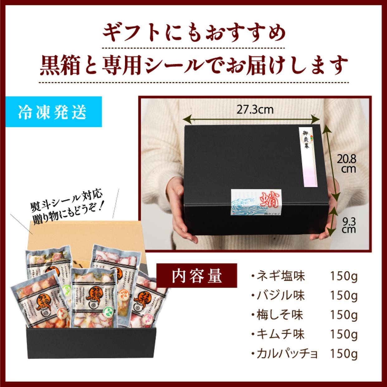 餌が豊富な海で育った旨味がたっぷり詰まった真ダコを、人気の5種の味付けの詰合せにしました!