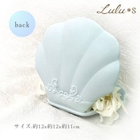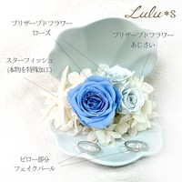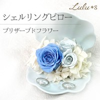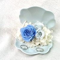シェル(貝殻)の形をした陶器の花器にサムシングブルーのバラをアレンジしたリングピローです。