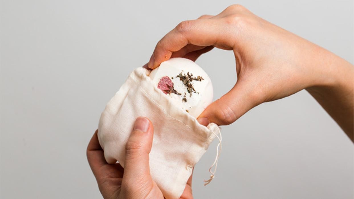 繰り返し使える付属のリユーザブルティーバッグにバスボムを入れてお楽しみください。