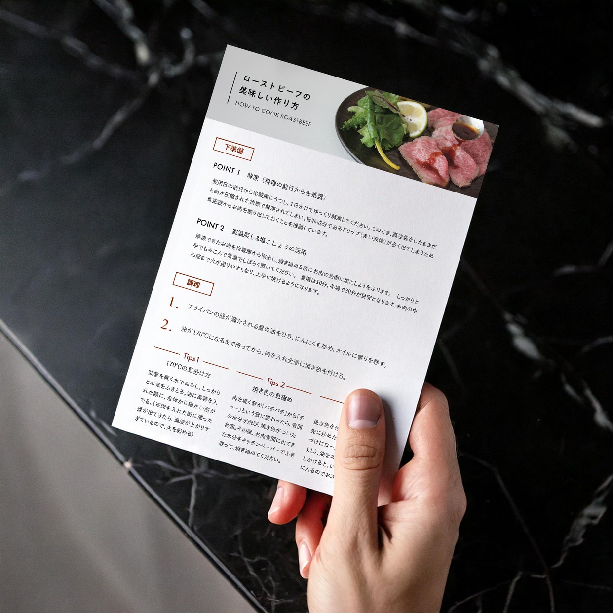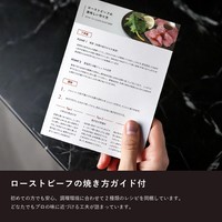 初めてでも安心、ローストビーフの焼き方ガイド同封。ご購入者様のライフスタイルや調理時間に合わせて選べる、所要時間の異なる2つのパターンをご用意。初心者の方でも安心して取り組める方法から、じっくりと仕上げる本格的な方法まで、どなたでもプロの味に近づける工夫が詰まっています。
