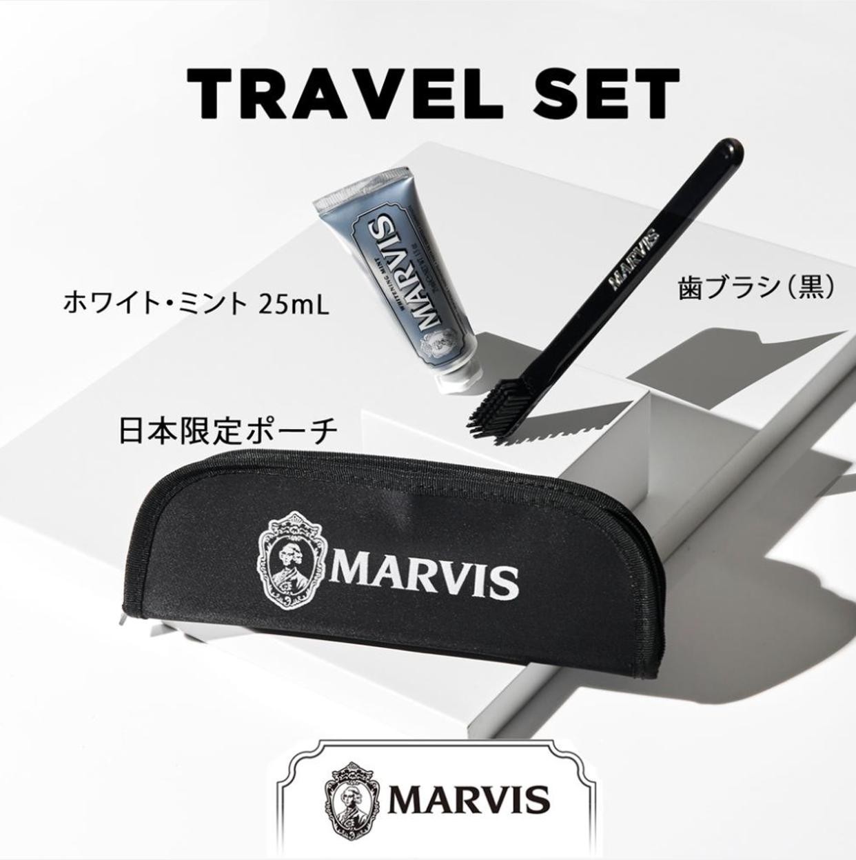 【自分用&プレゼントに人気のアイテム】MARVIS のイメージカラーであるブラックを基調とした、お洒落で スタイリッシュなオリジナルポーチと、日本で一番人気のフレーバー〝ホワイト・ミント〟、さらにトゥースブラシをセットにした日本限定のトラベルセットです。