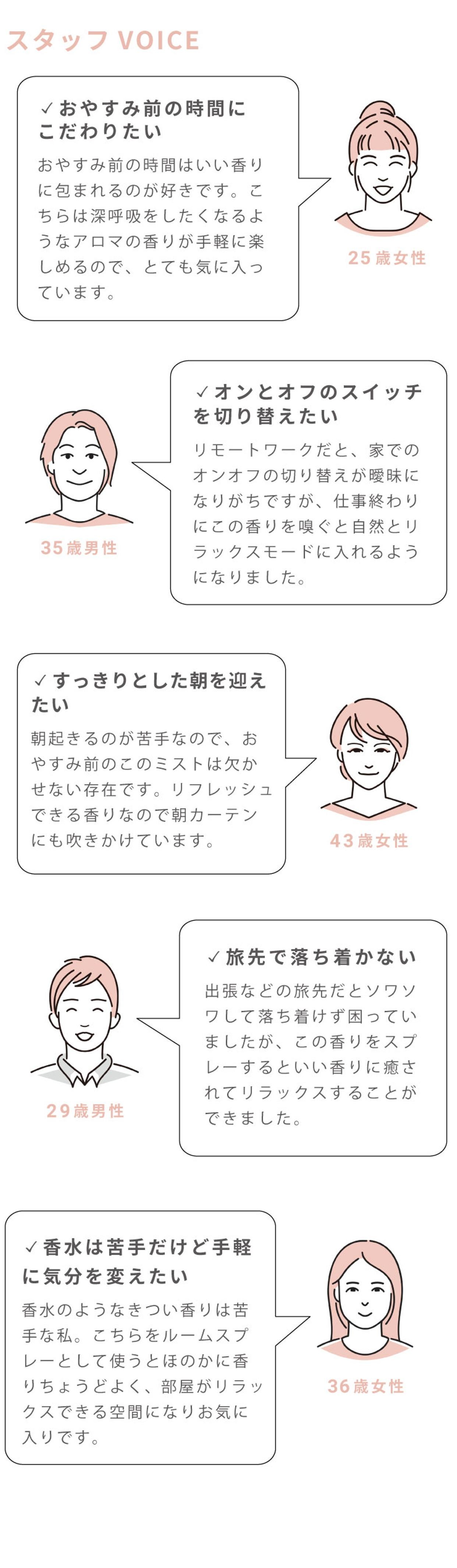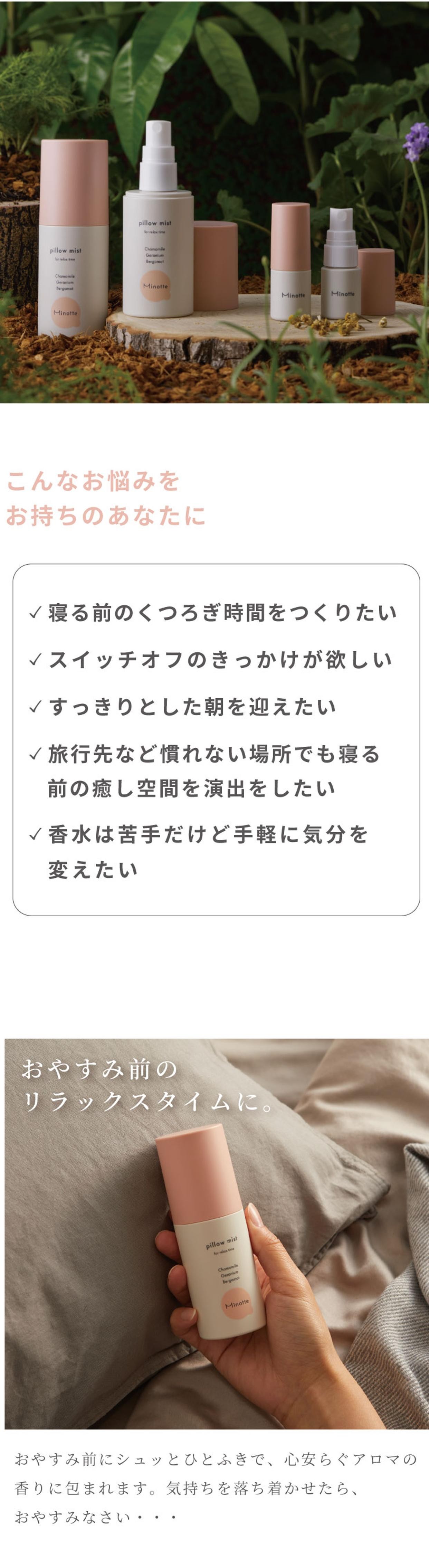 おやすみ前にシュっとミストするだけで、ゆったりした時間を過ごすことができます。