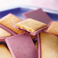 チョコレート(国内製造)、小麦粉、ハスカップソース(麦芽糖、ハスカップピューレ、還元水あめ、砂糖、水あめ)、砂糖、バター、液卵、ショートニング、乾燥ハスカップパウダー、食塩/着色料(ビートレッド、クチナシ)、トレハロース、膨張剤、乳化剤、酸味料、増粘剤(ペクチン)、香料、酸化防止剤(V.E)、(一部に小麦・卵・乳成分・大豆を含む)
