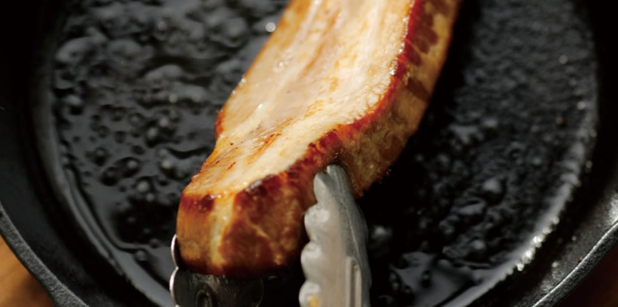 国産豚の中でも脂のりがよく味のよい豚バラ肉と、平釜で海水を煮詰めて作った塩、喜界島の粗糖、国産の香味野菜。余計なものは入れず、シンプルな材料のみで職人が丁寧に仕上げた、肉本来の旨みと燻製の香りをしっかりと感じる自家製ベーコン。