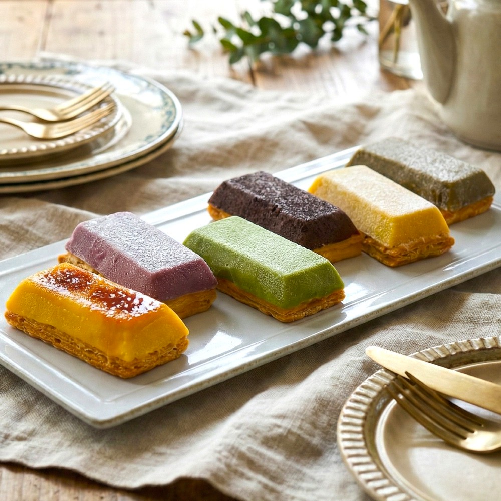 なめらかな口溶けのさつまいものペーストにサクサク256層のパイ生地を合わせた新食感のスイートポテトです。あえて焼かずに仕上げることでクリーミーな食感に仕立てています。定番人気の6種類のフレーバーをお楽しみいただけます。