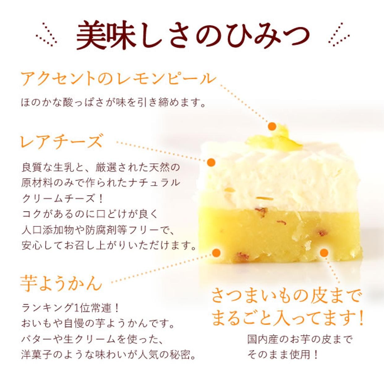 主役の芋羊羹の味を損なわず、レアチーズも味わいをしっかり残しこれまでの芋ようかんの常識を覆す一品です。