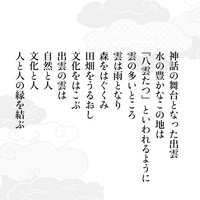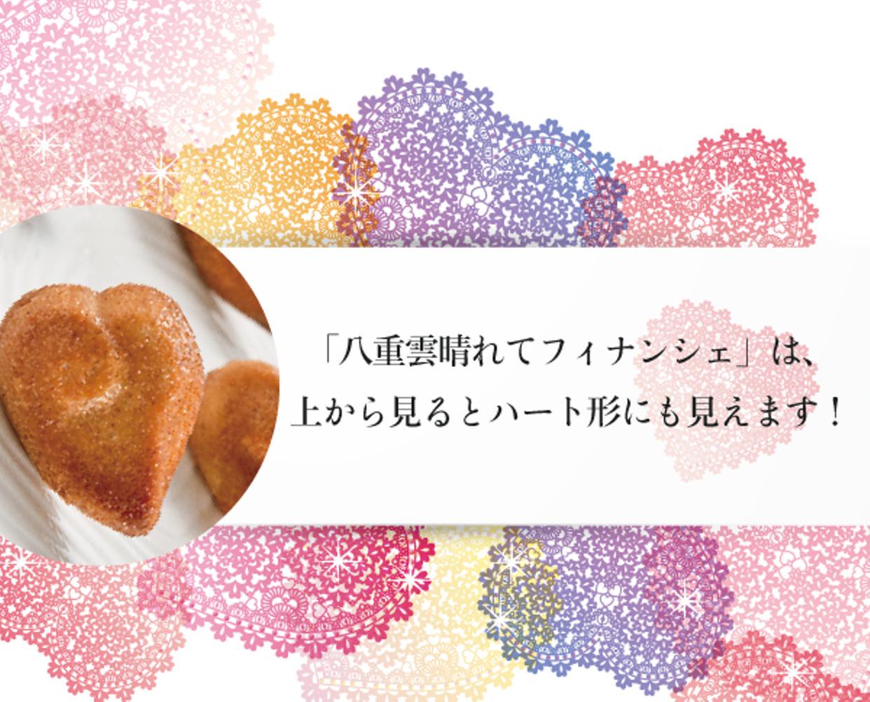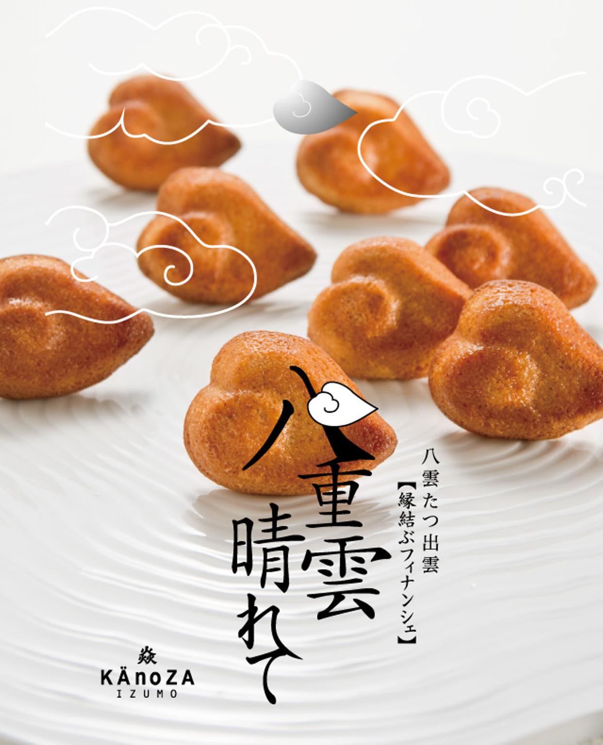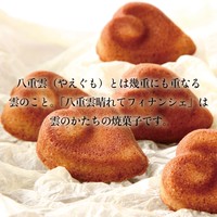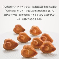 八重雲(やえぐも)とは幾重にも重なる雲のこと。八重雲晴れてフィナンシェ」は出雲大社本殿の天井絵「八雲の図」をモチーフにした雲のかたちの焼菓子で、縁結びの神様・出雲大社の“さまざまなご縁を結ぶ”という願いを込めました。雲立つ出雲 縁結ぶフィナンシェです。