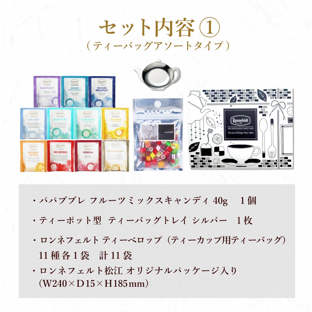 ① 紅茶・緑茶・ルイボスティー・フルーツティー…、とバラエティ豊かな11種類が入った【アソートタイプ】、