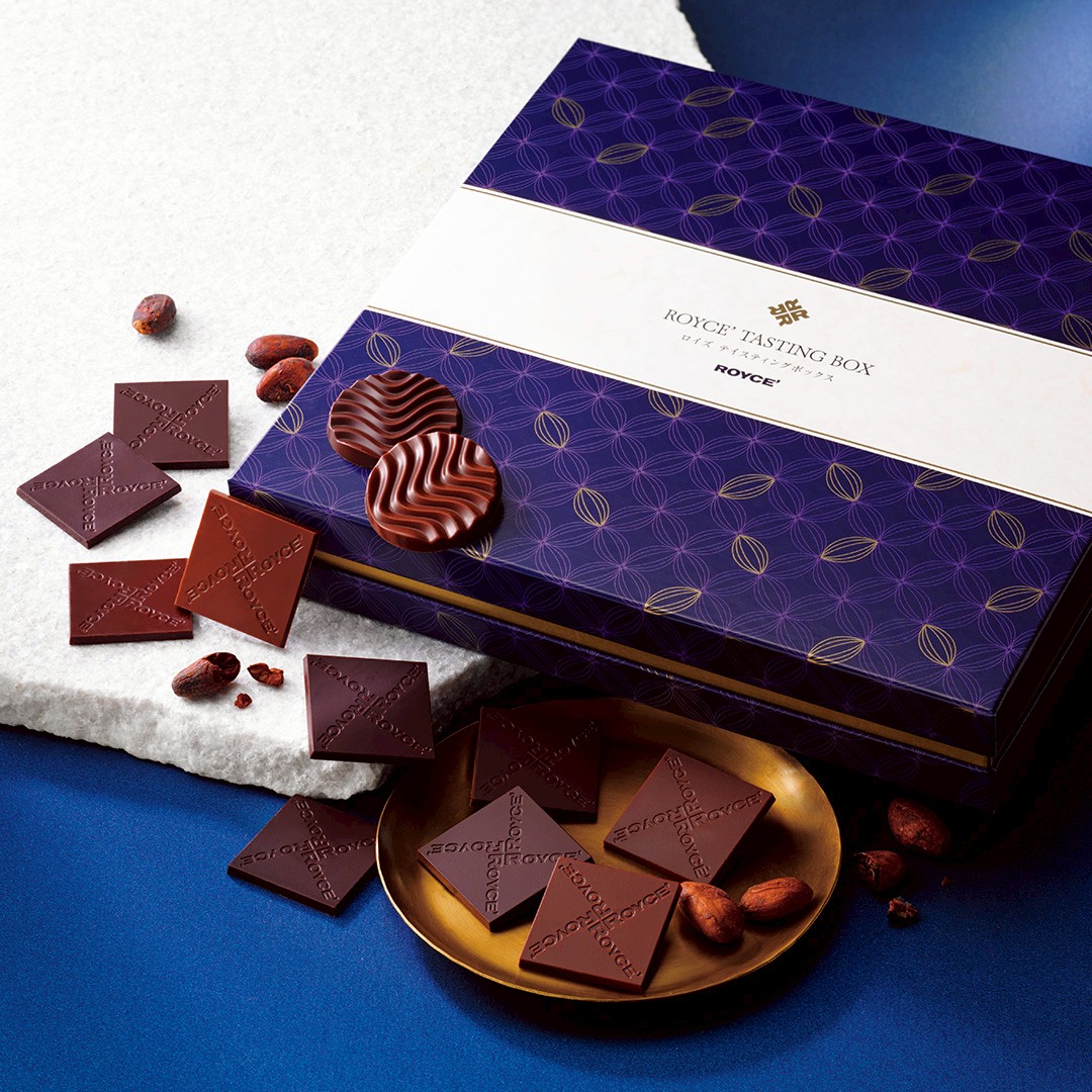 理想の口どけを追求した「ピュアチョコレート」、カカオ豆の個性を最大限に生かした「ロイズアロマチョコレートコレクション」、産地ごとで異なるカカオの特長を味わう「ロイズオリジンチョコレート」をひと箱に。テイスティングの楽しみを、じっくりと心ゆくまで。