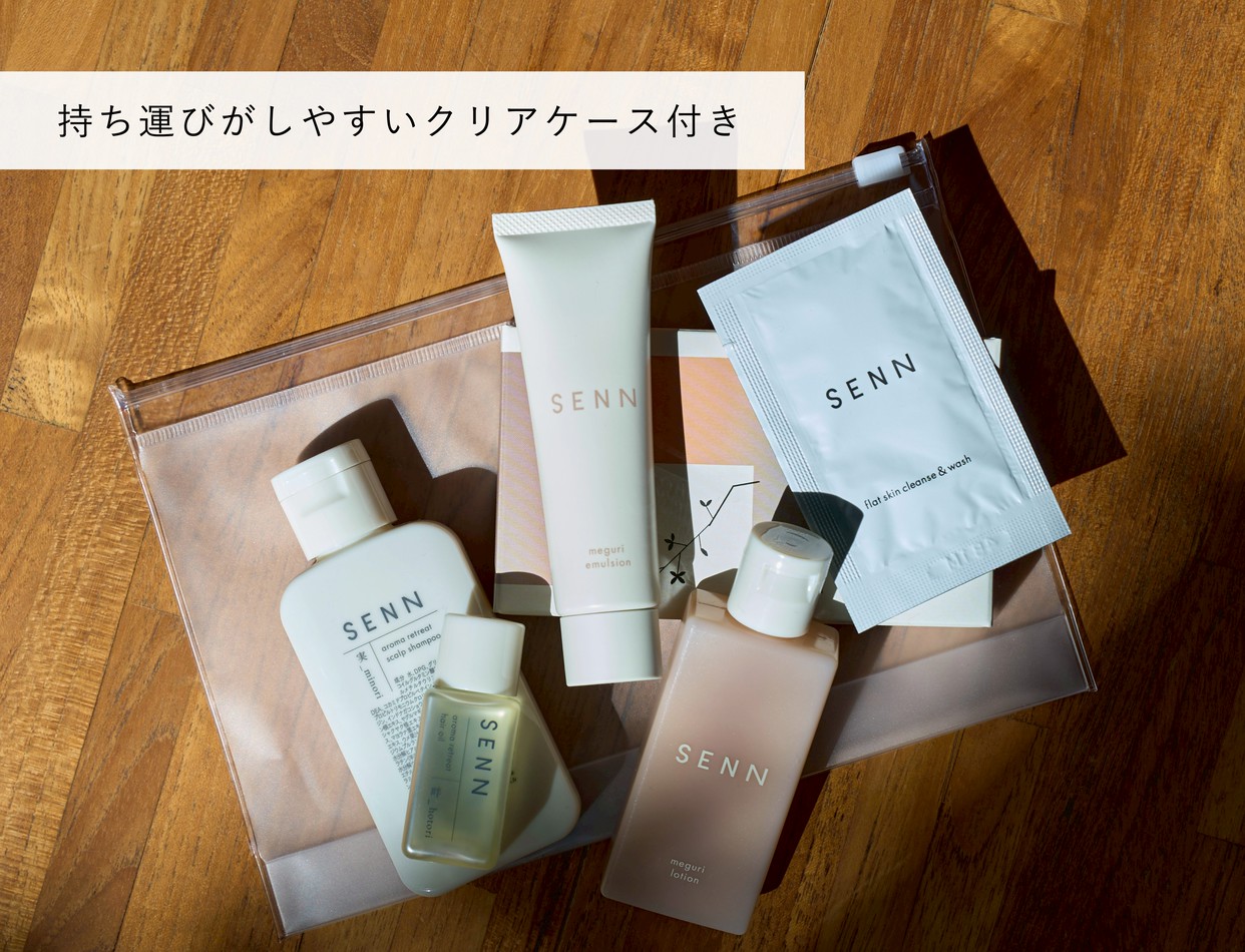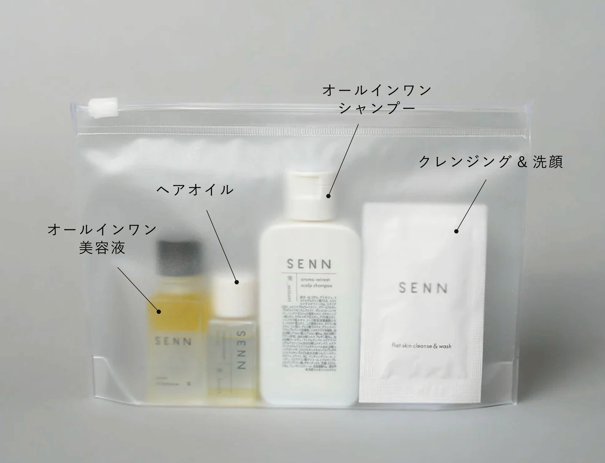 SENNの人気スキンケア・ヘアケアアイテムを、旅先やお試しにぴったりな限定ミニサイズで詰め合わせた特別なギフトセットです。