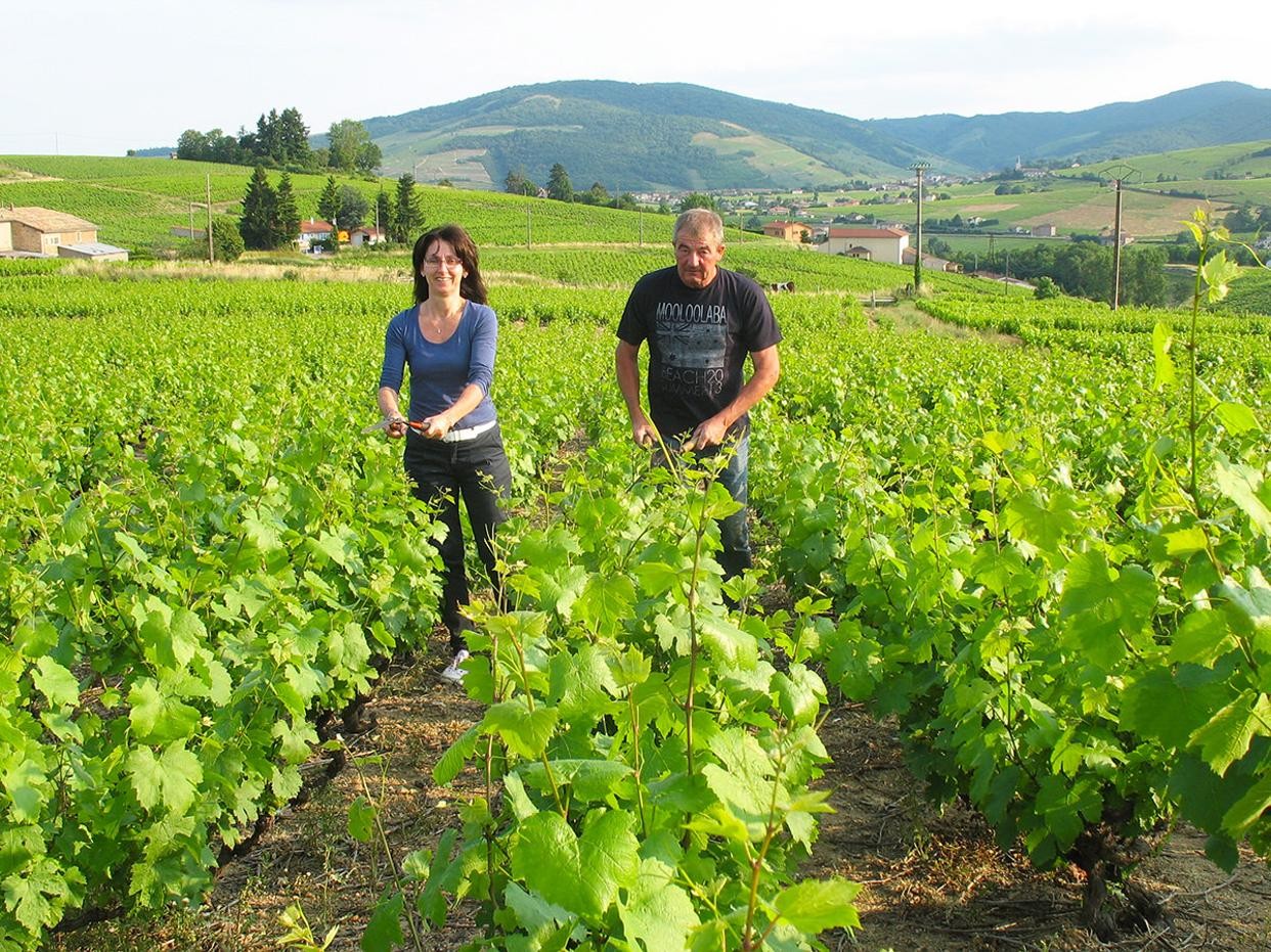蔵元のドメーヌ・ド・ラ・プレーニュはボジョレ地区のレニエ村にあり、ブドウ樹の平均樹齢は40年。収穫は100%手摘み、選果もとても厳しく行っています。