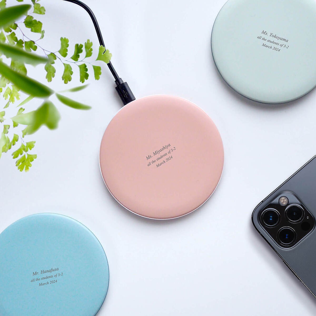 充電パッドの真ん中に名前やメッセージをプリントできます。充電の度に目にするあなたからのメッセージで、毎日の笑顔をプレゼントしませんか?