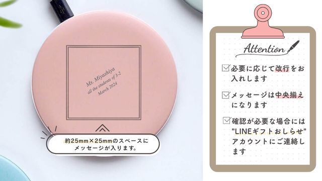 約 25 x 25 mm にご希望のメッセージが入ります。心も充電するメッセージを入れてプレゼントできます。